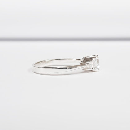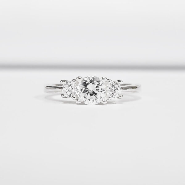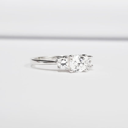 Moissanite three stone trilogy engagement ring in white/rose/yellow gold or platinum