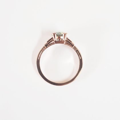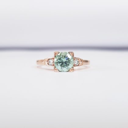 Mint green Moissanite and diamond art deco 1920’s inspired engagement engraved thin ring handmade in gold or platinum
