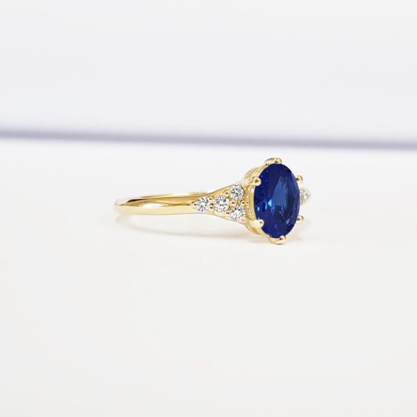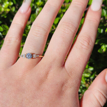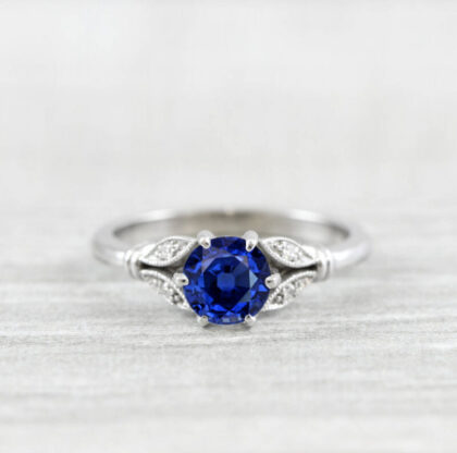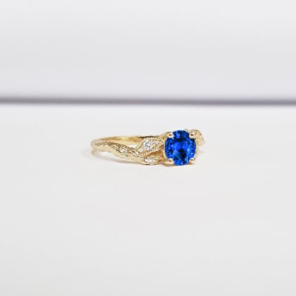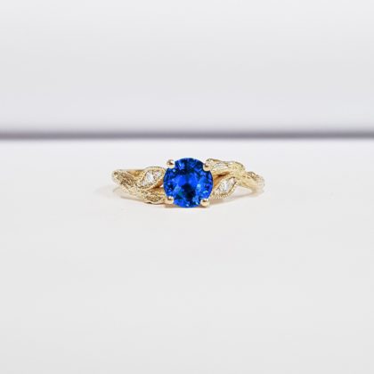 Lab grown sapphire and diamond round engagement solitaire nature inspired leaf floral ring in gold handmade for her UK
