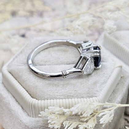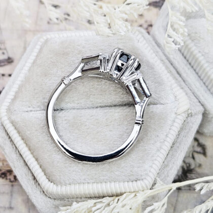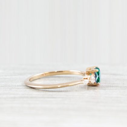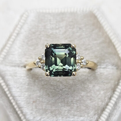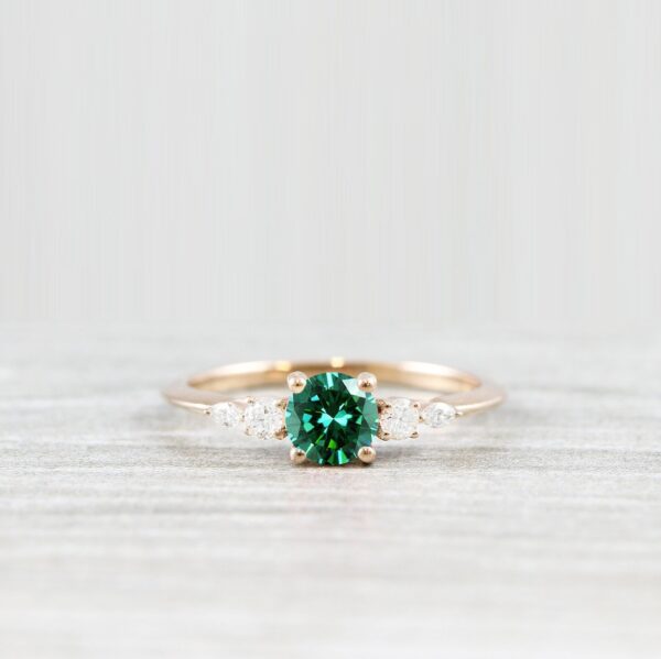 Teal green moissanite engagement ring handmade in rose gold with diamonds marquise 5 stone antique inspired