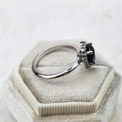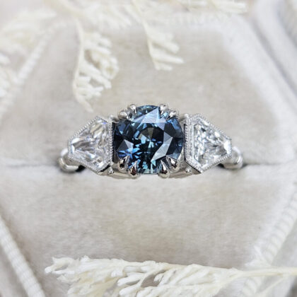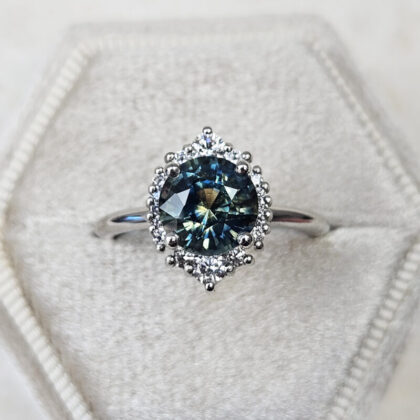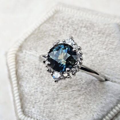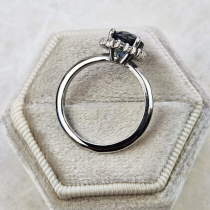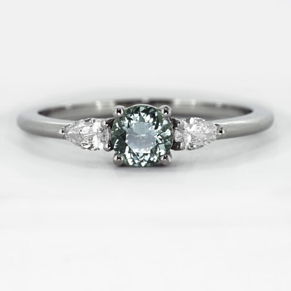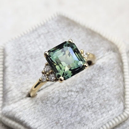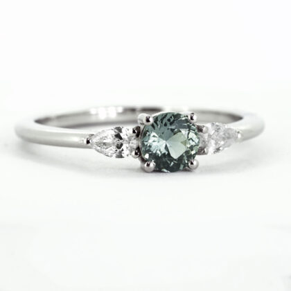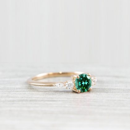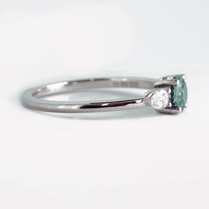 Teal green moissanite and diamond round engagement solitaire nature inspired leaf floral ring in gold handmade for her UK