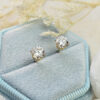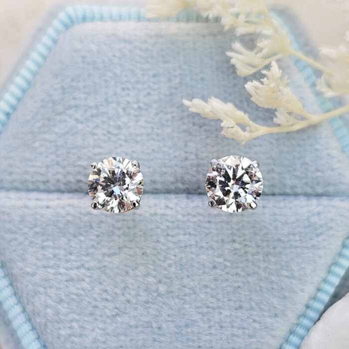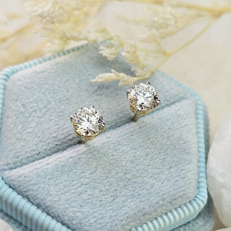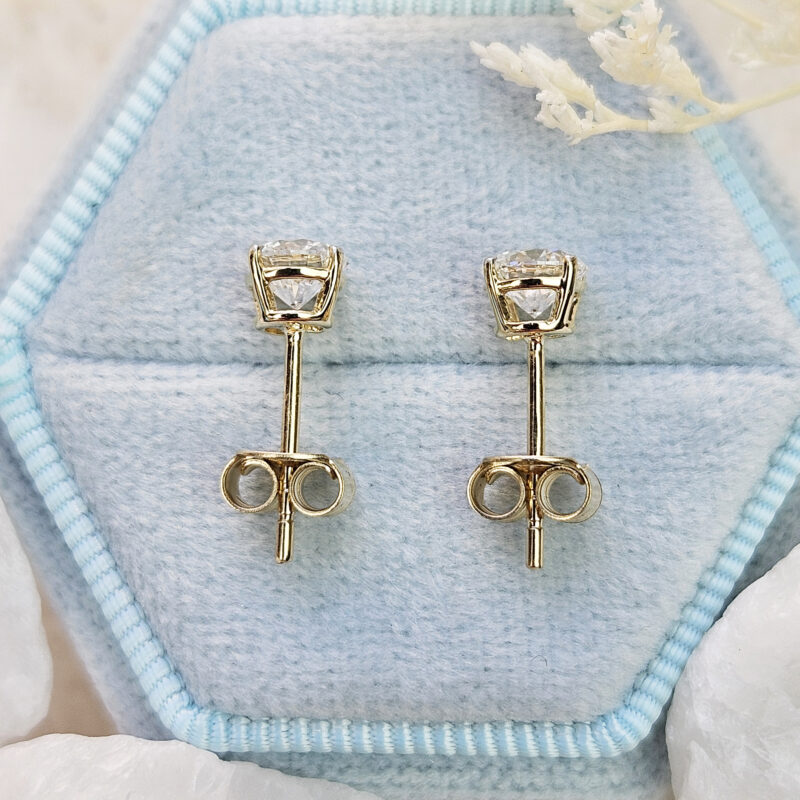 These beautiful studs feature two 0.5ct round brilliant cut diamonds in a classic 4 prong basket setting. The earrings are in solid 14ct yellow gold with a simple scroll style friction earring back.