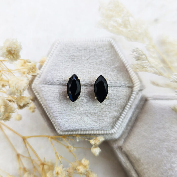 Simple 4 prong stud earrings set with striking black Onyx in a classic marquise shape.