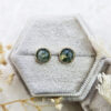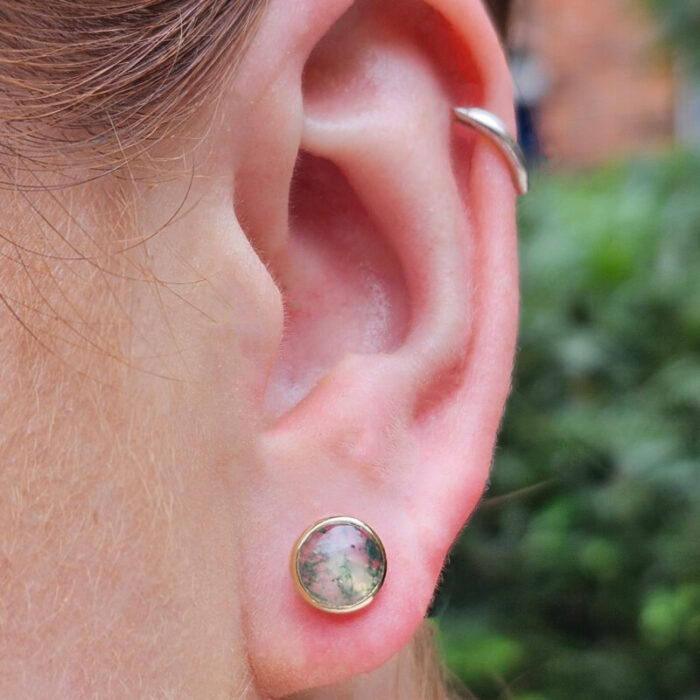 Featuring two round moss agate cabochons and rubover set in a minimalistic 14ct yellow gold stud earring setting.
