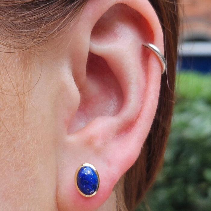 Two rich blue oval cut lapis lazuli cabochons, bezel set in a minimalistic yet striking 14ct stud earring.