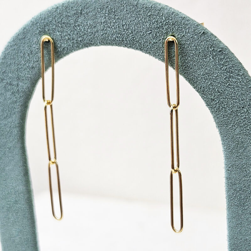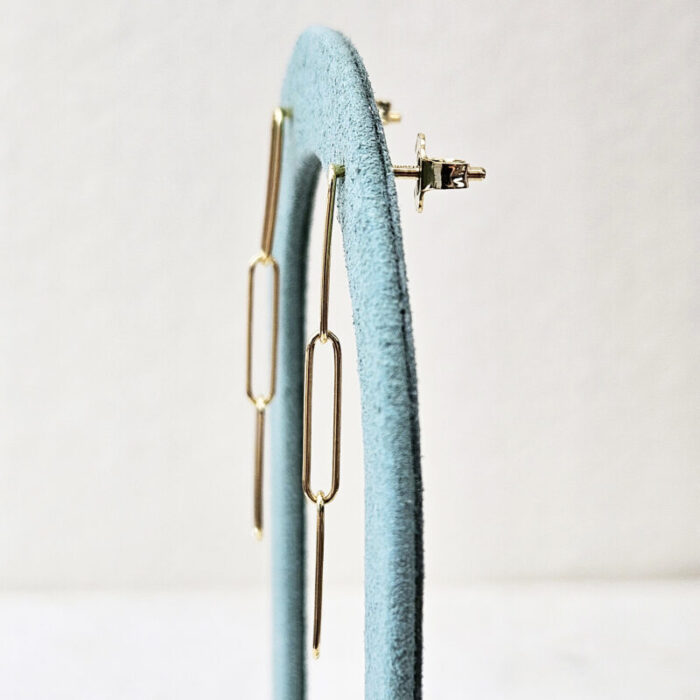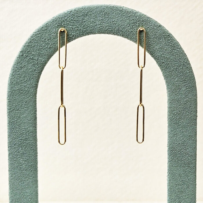 Minimalistic 3 paperclip drop earrings in solid 14ct yellow gold with a classic scroll back closure. Very demure.