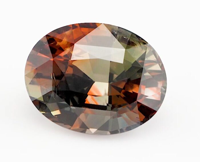Parti sapphires are multicoloured sapphires. Normally these will show hues of green, blue and yellow, but this one is totally unique, I’ve never seen anything quite like it. It swims with hues of rich orange, seafoam green, pale blue and grey! Reminiscent of a lakeside forest landscape as the leaves begin to fall, you can truly get lost staring into this gem.