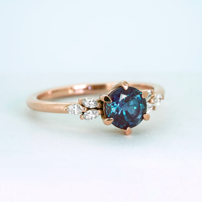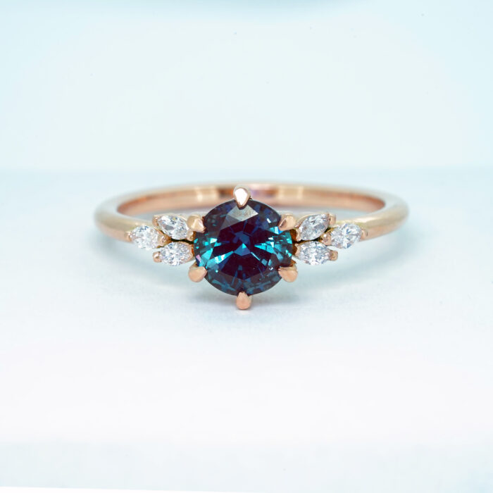 This brand new stunning ring features a central round cut lab grown Alexandrite, that has been claw set with 6 marquise cut diamonds in a floral style setting!