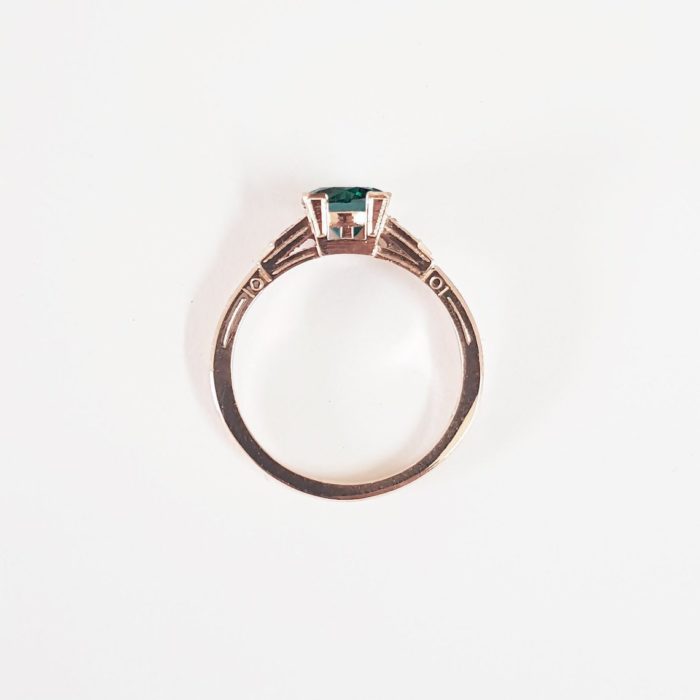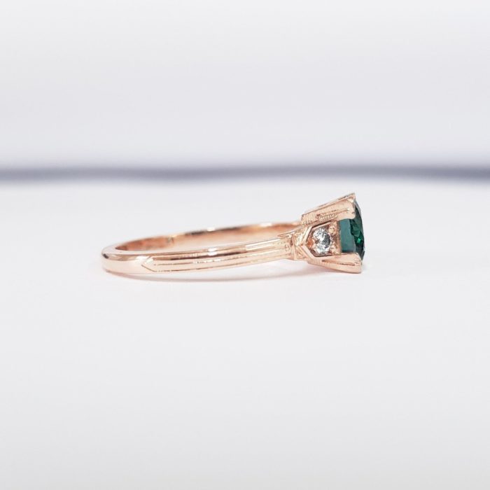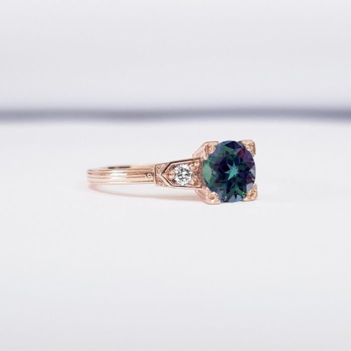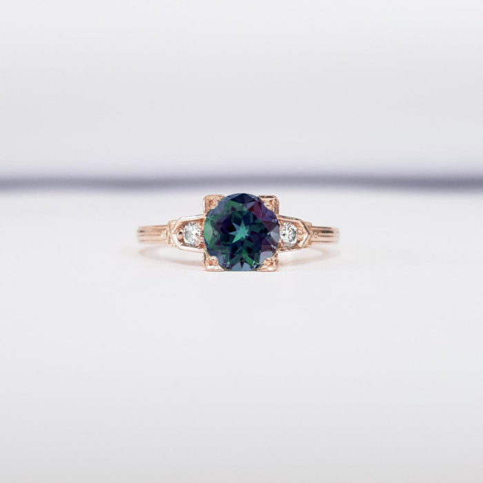 This brand new stunning ring features a central 1 carat lab grown alexandrite, flanked by two diamonds in an art deco inspired! The ring is engraved with fine detailing to make it truly unique.