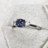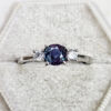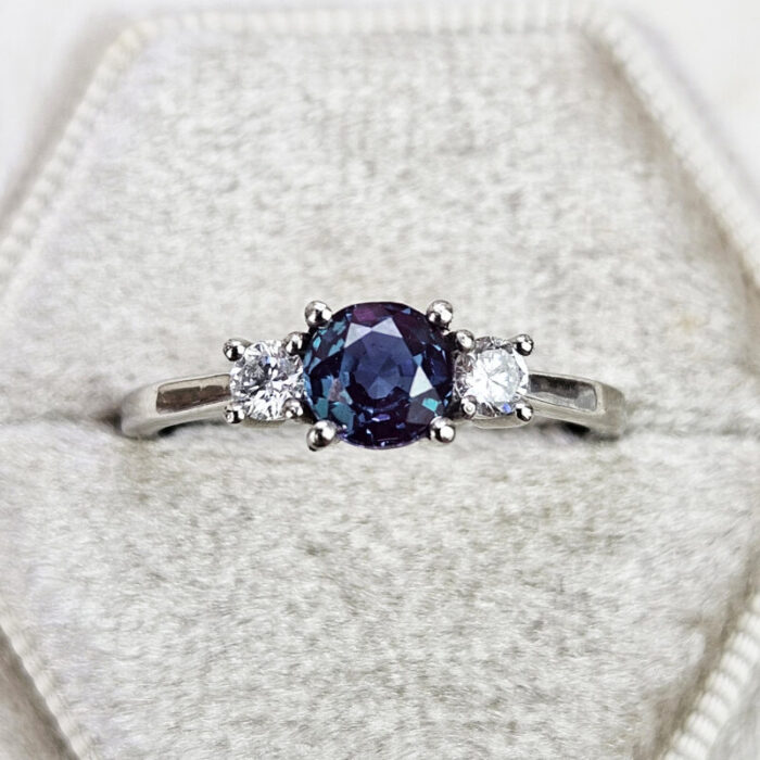 This beautiful ring features a central round cut lab grown Alexandrite, flanked by two brilliant cut lab grown diamonds in a classic low profile platinum setting!