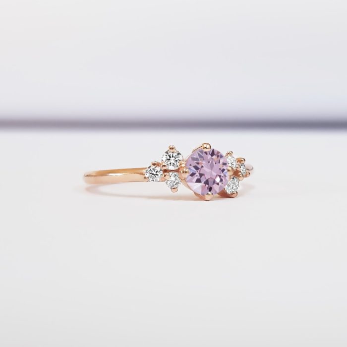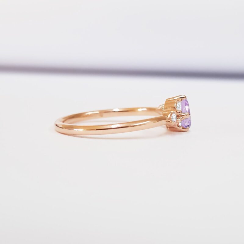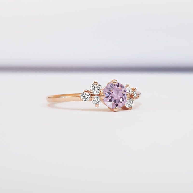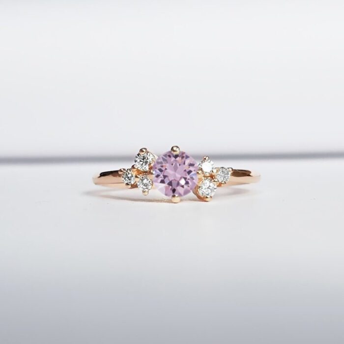 This brand new stunning ring features a central round cut Amethyst, that has been claw set with 6 brilliant cut diamonds, in a sleek and elegant low profile mount.