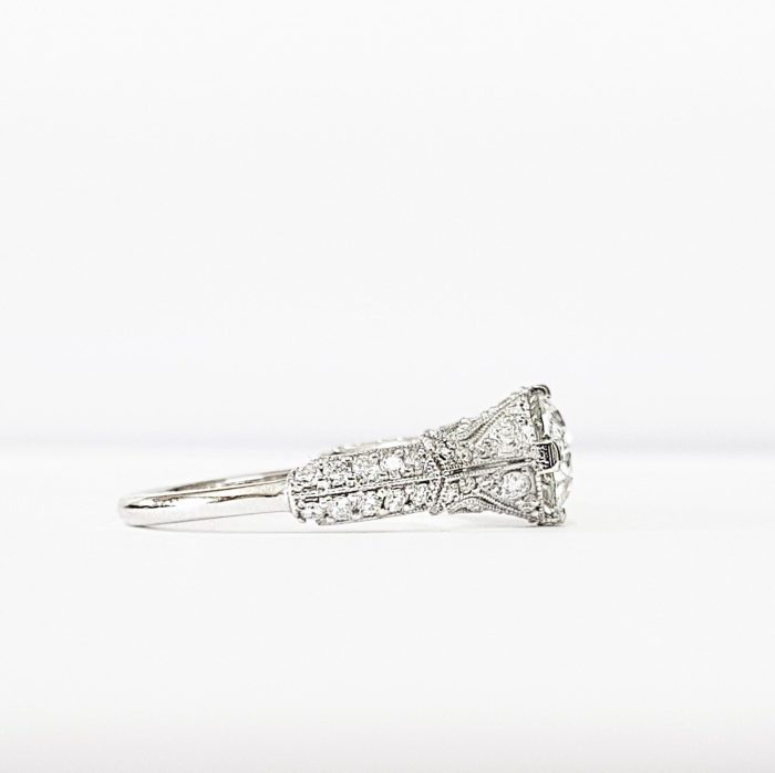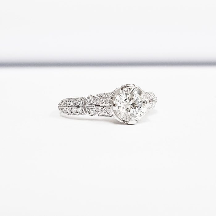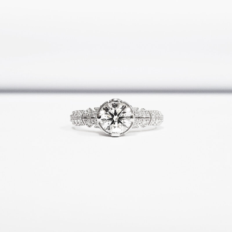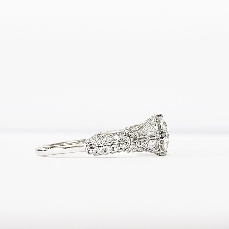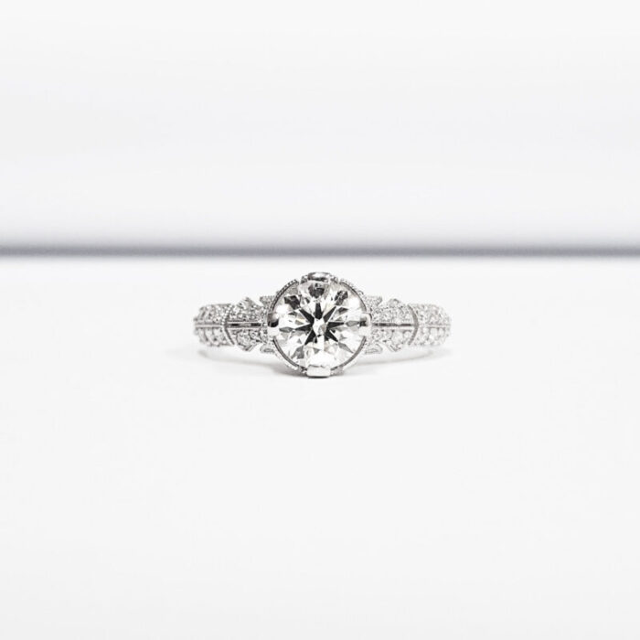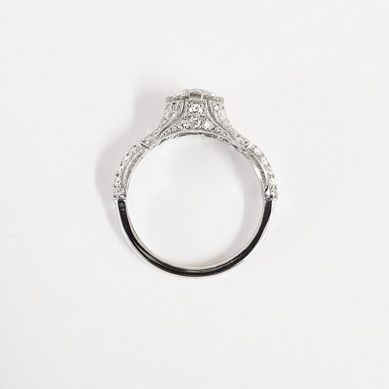 This breathtaking ring features a central brilliant cut Moissanite, set in a stunning ornate mount, that has been painstakingly set with 48 individual diamonds!