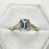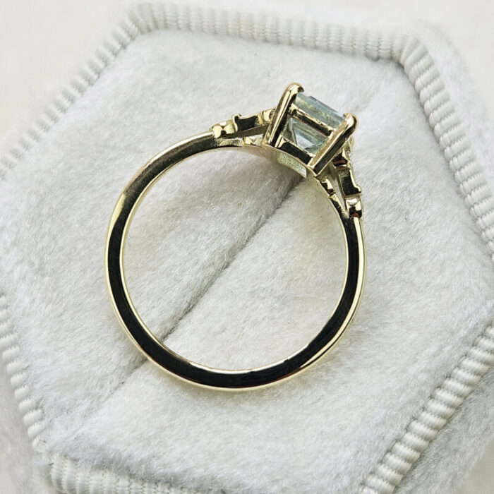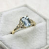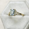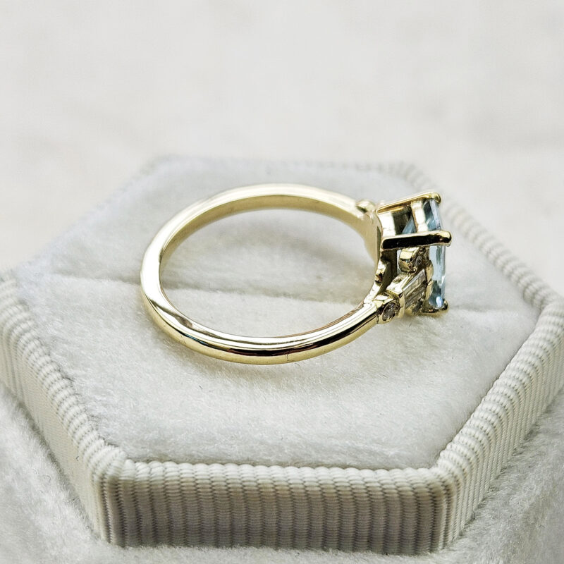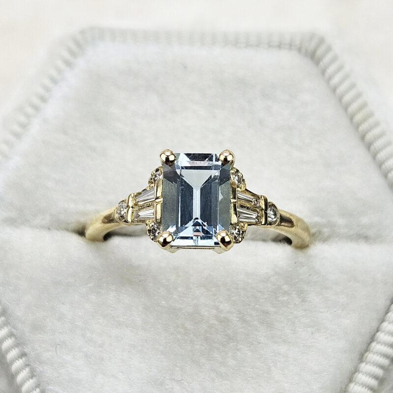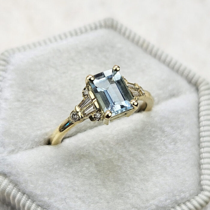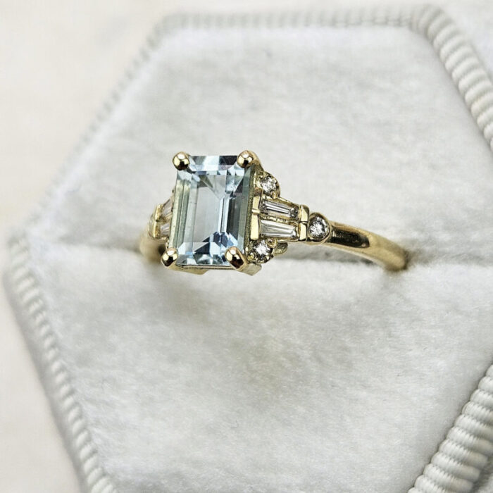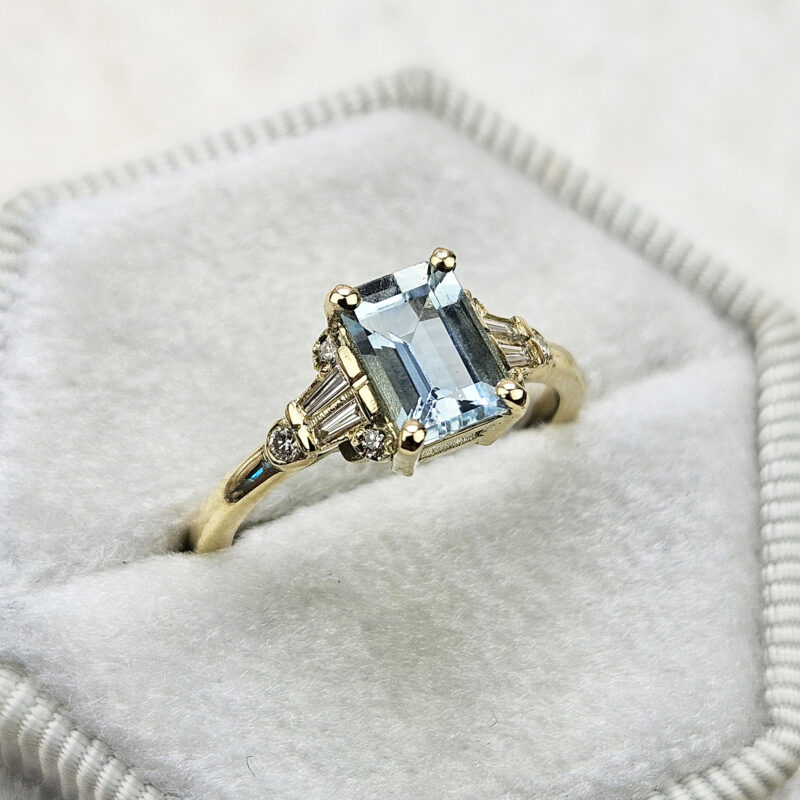 This absolutely gorgeous ring features a dazzling natural emerald cut Aquamarine, with 4 tapered baguette and 6 brilliant cut diamond accents in 18ct yellow gold!