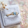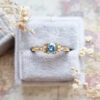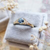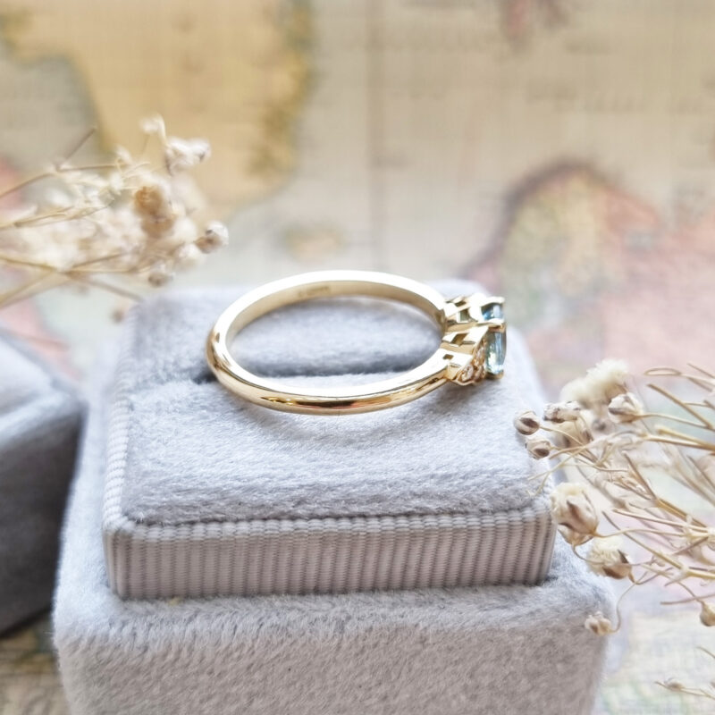 This brand new stunning ring features a central round cut blue Aquamarine, flanked by 6 diamonds in 18ct yellow gold!