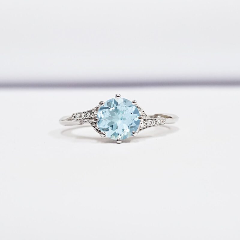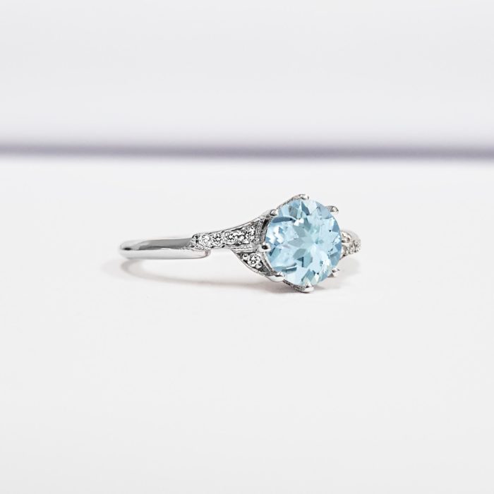This brand new stunning ring features a central 1 carat aquamarine, set in a stunning antique 1920s inspired mount that has been studded with a further 10 diamonds!
