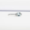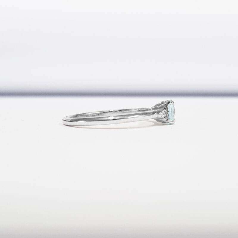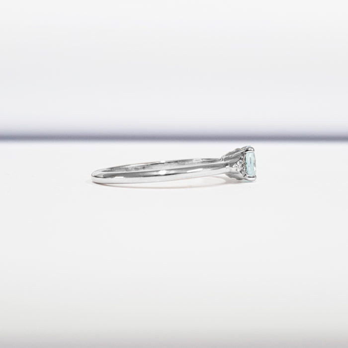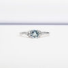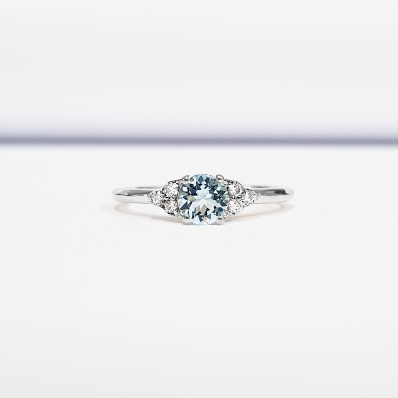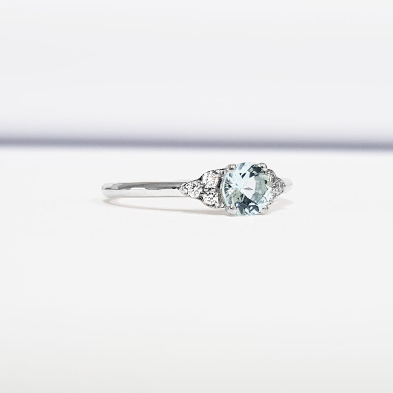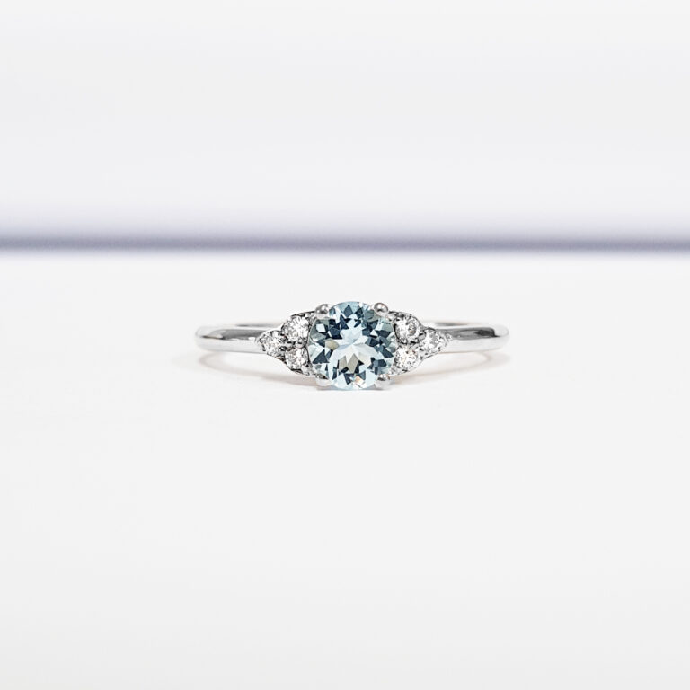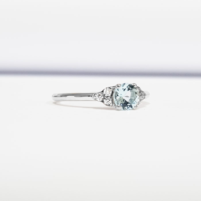 This brand new stunning ring features a central round cut blue Aquamarine, flanked by 6 diamonds in a gold or platinum mount!