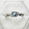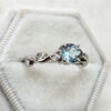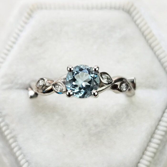 This elegant ring features a central round cut aquamarine, that has been 4 prong set in a classic basket setting. The weaving band of the ring has been adorned with rubover-set marquise cut diamonds to resemble leaves on a vine!