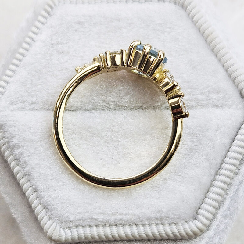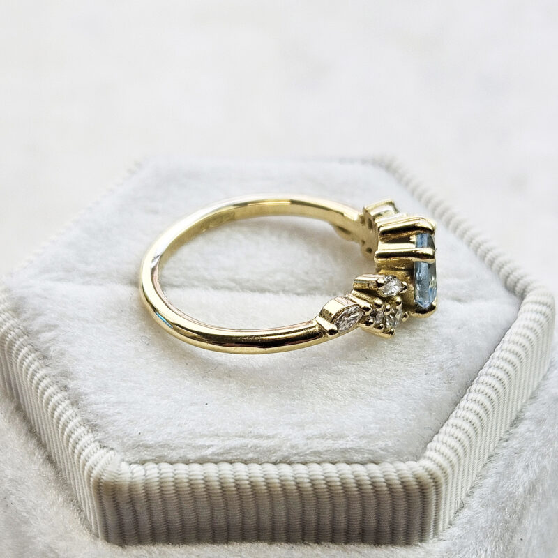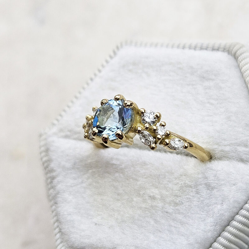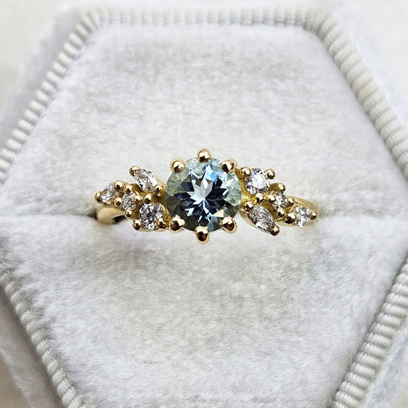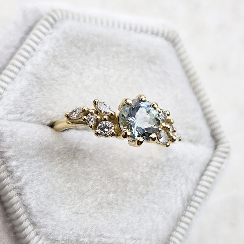 This brand new ring features a mesmerizing round cut natural aquamarine, set with a mixture of marquise and round cut diamonds in a flowing, floral inspired pattern. The ring is designed to be low profile from the finger.