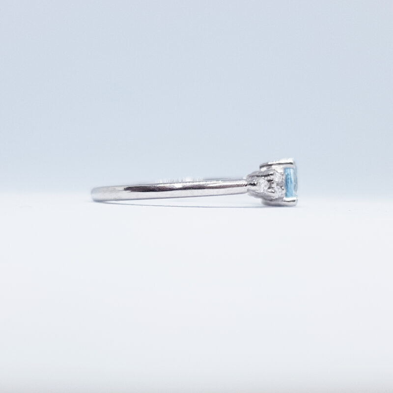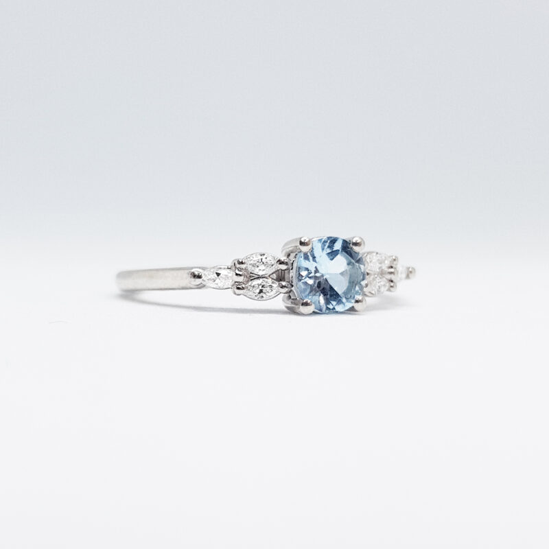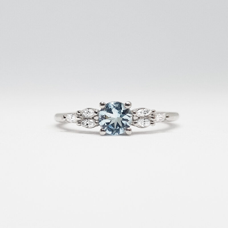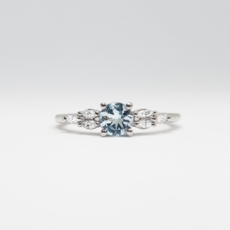 This brand new stunning ring features a central 0.5 carat Aquamarine, set in a stunning delicate mount that has been claw set by 6 marquise cut diamonds!