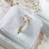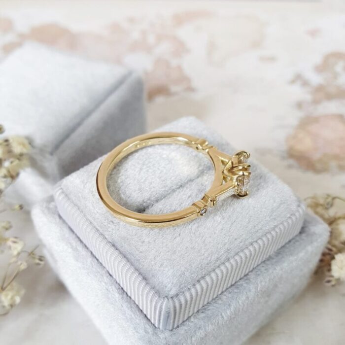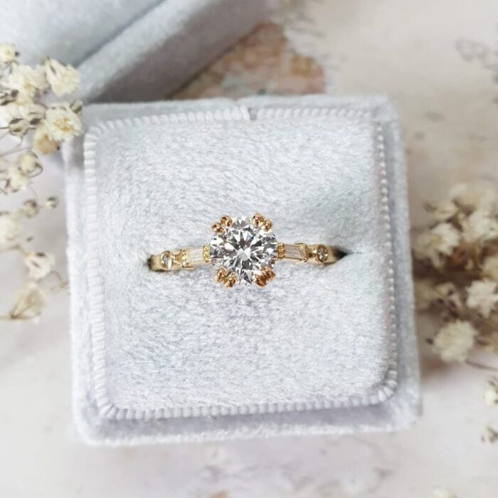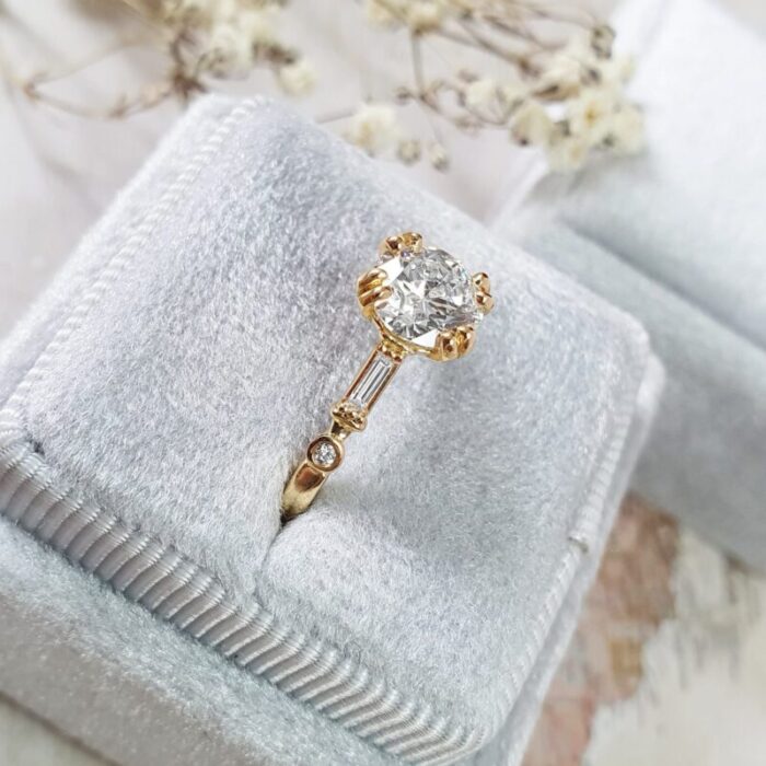 This brand new ring features a central 1 carat round brilliant cut lab grown diamond, that has been double prong set with geometrically contrasting baguette and round cut accent diamonds to give a distinct 1920s feel.