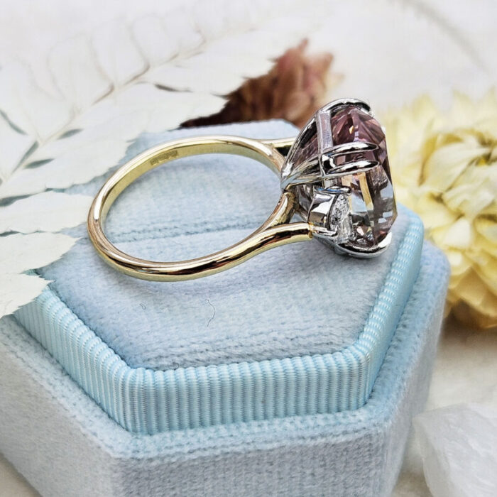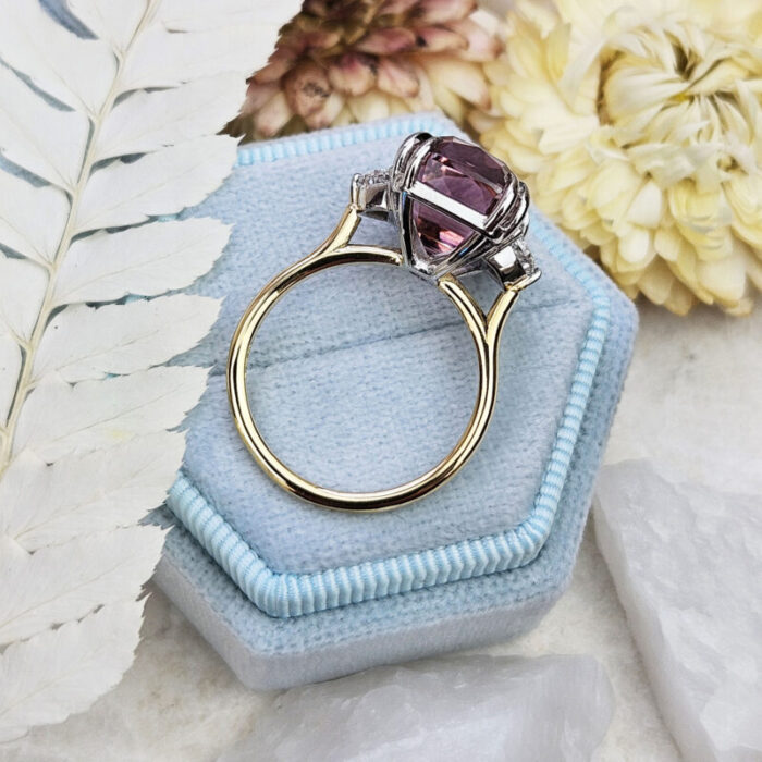 This brand new one of a king ring features a beautiful natural bi colour cushion cut tourmaline. The tourmaline displays fantastic hues of pink pale blue at different angles and in different lighting. It has been double talon set with a half moon lab grown diamond either side, in a low profile platinum head and 18ct yellow gold band!