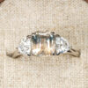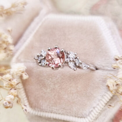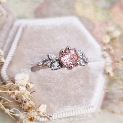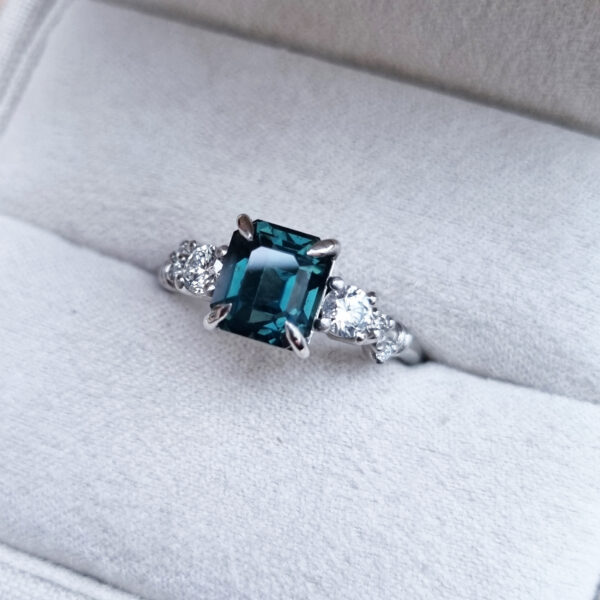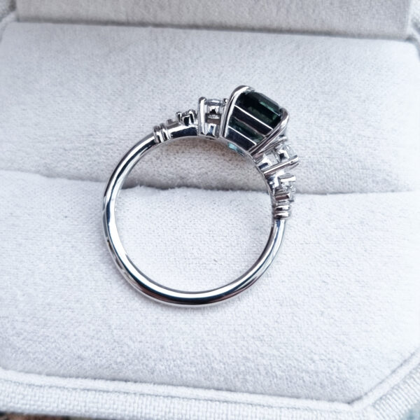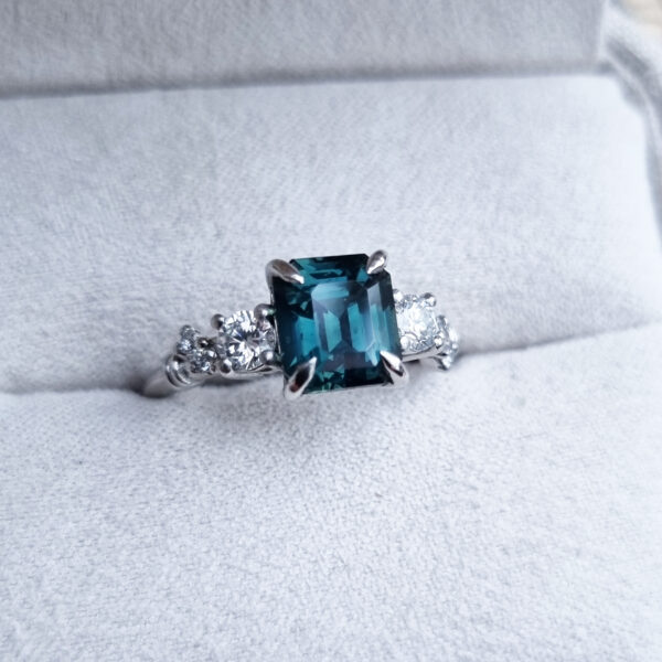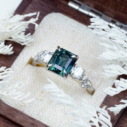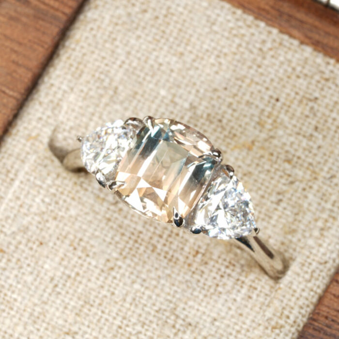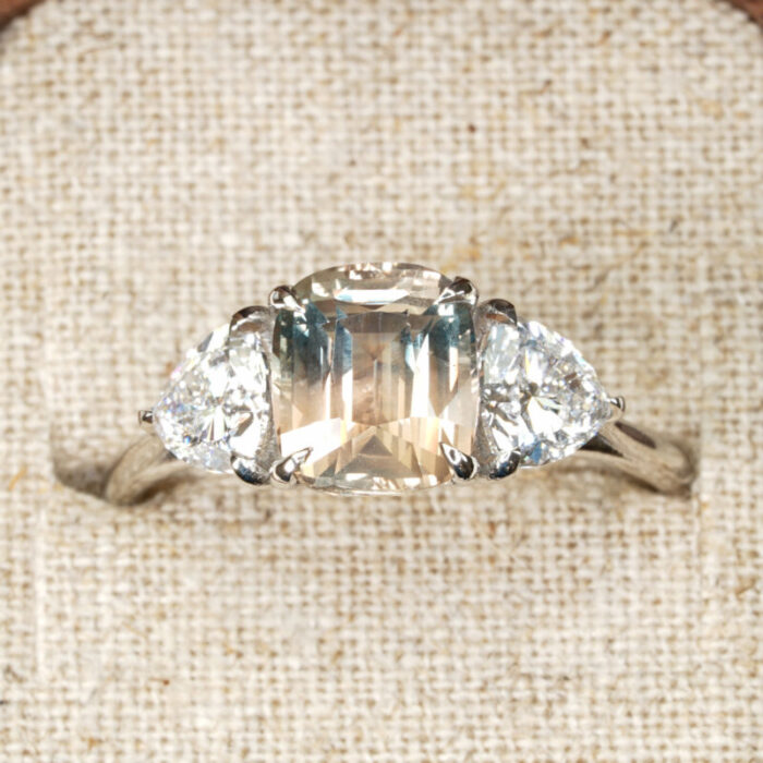 This brand new stunning ring features a central 2.64ct cushion cut natural bi colour sapphire, displaying hues of seafoam green and peach. It is flanked by two trillion cut lab grown diamonds in a stunning low profile platinum trilogy mount!