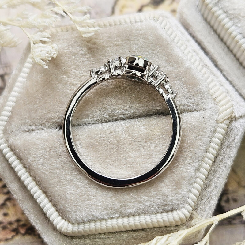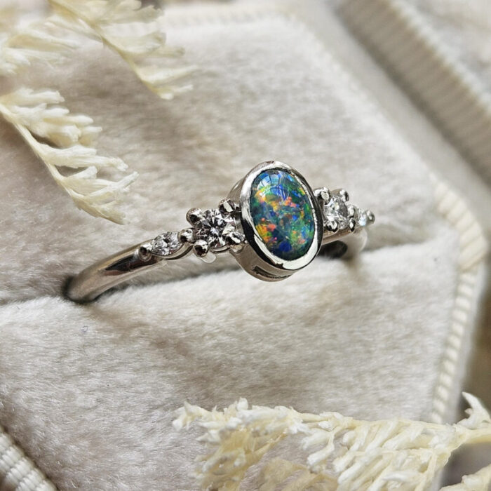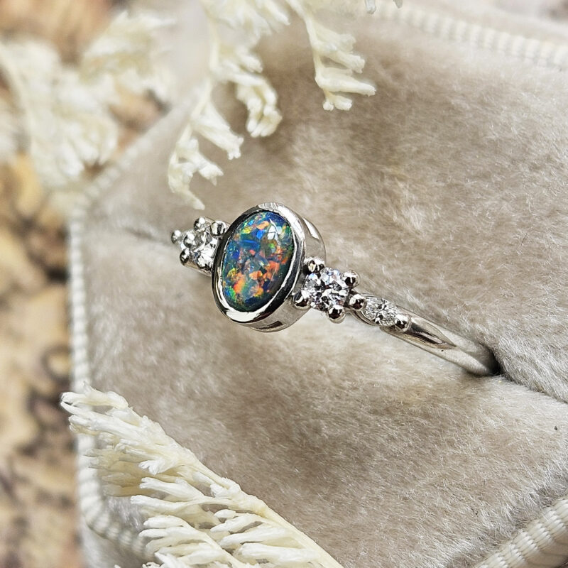 Center black Opal: 0.3ct, 5.7x4mm, oval cabochon cut, strong mixture of red, orange, yellow, blue and green