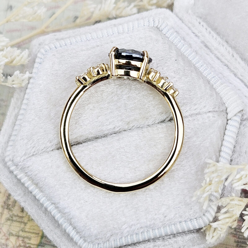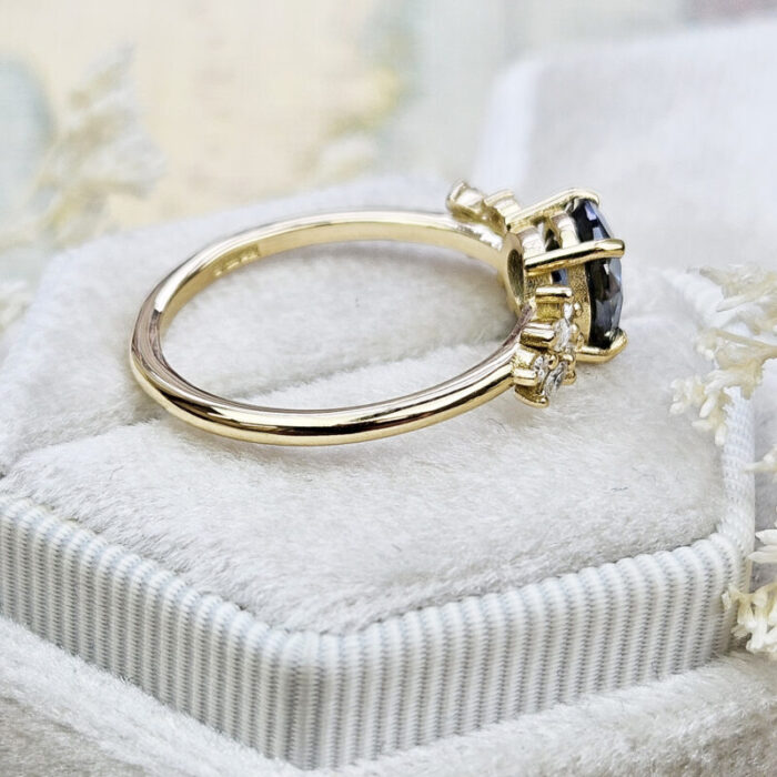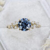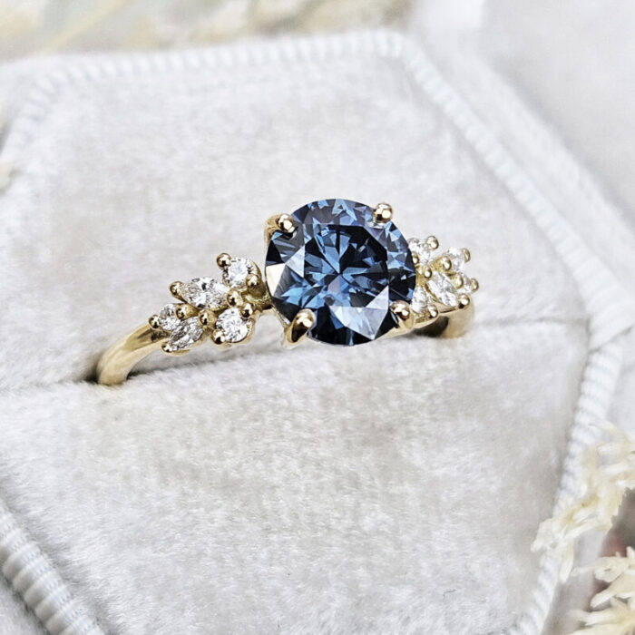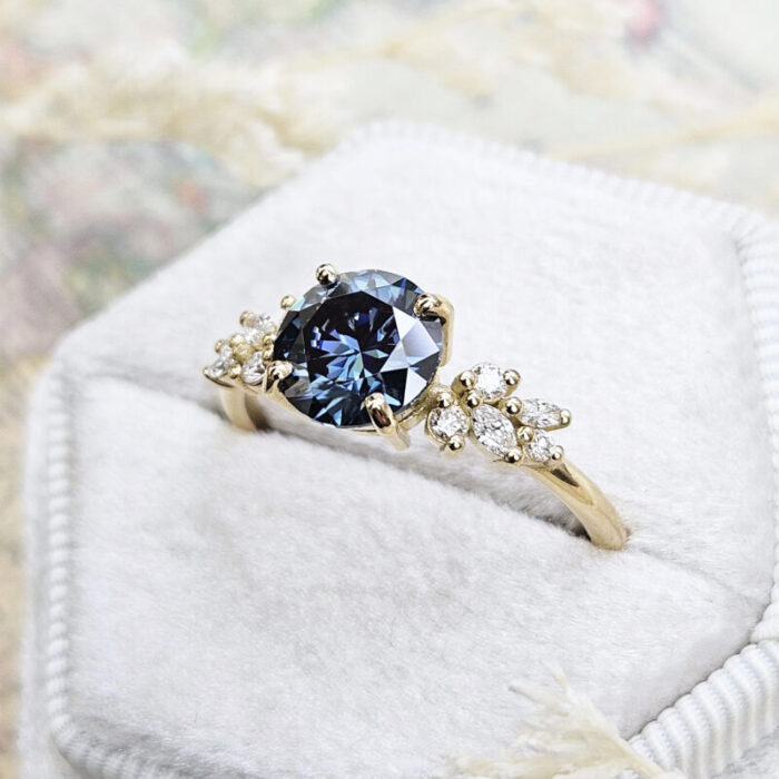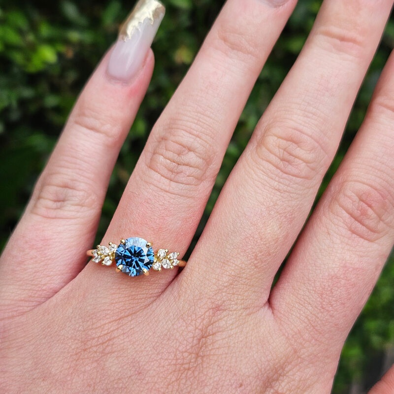 This ring features a central blue moissanite 7.5mm round cut. It is set with a mixture of round and marquise cut diamonds in a unique, low profile, floral inspired mount!