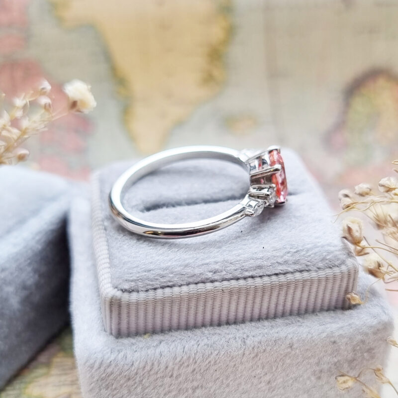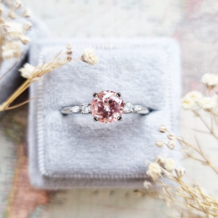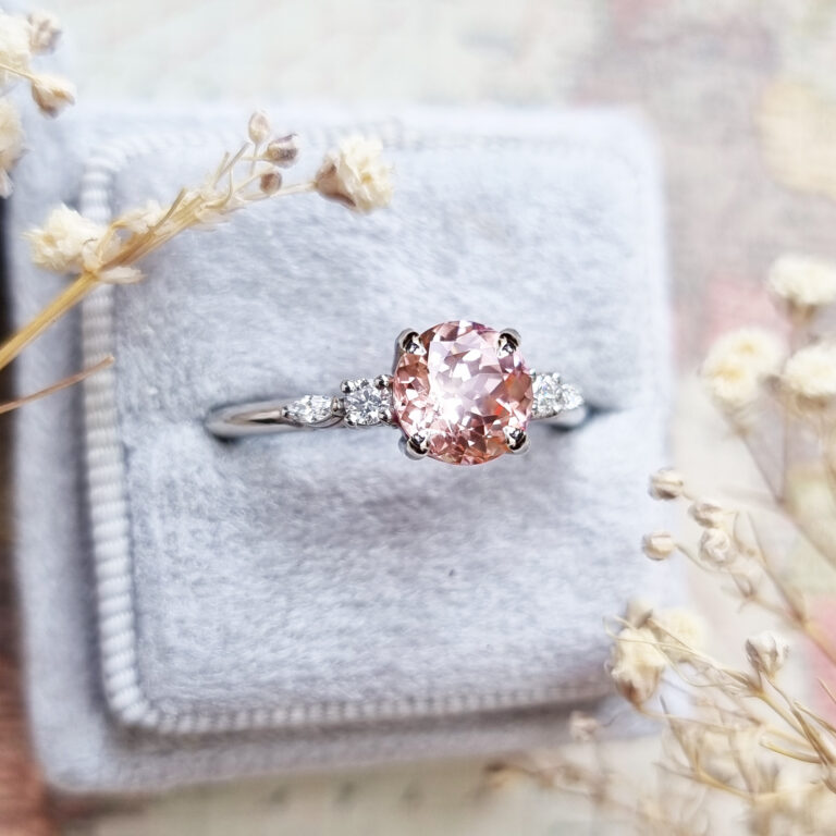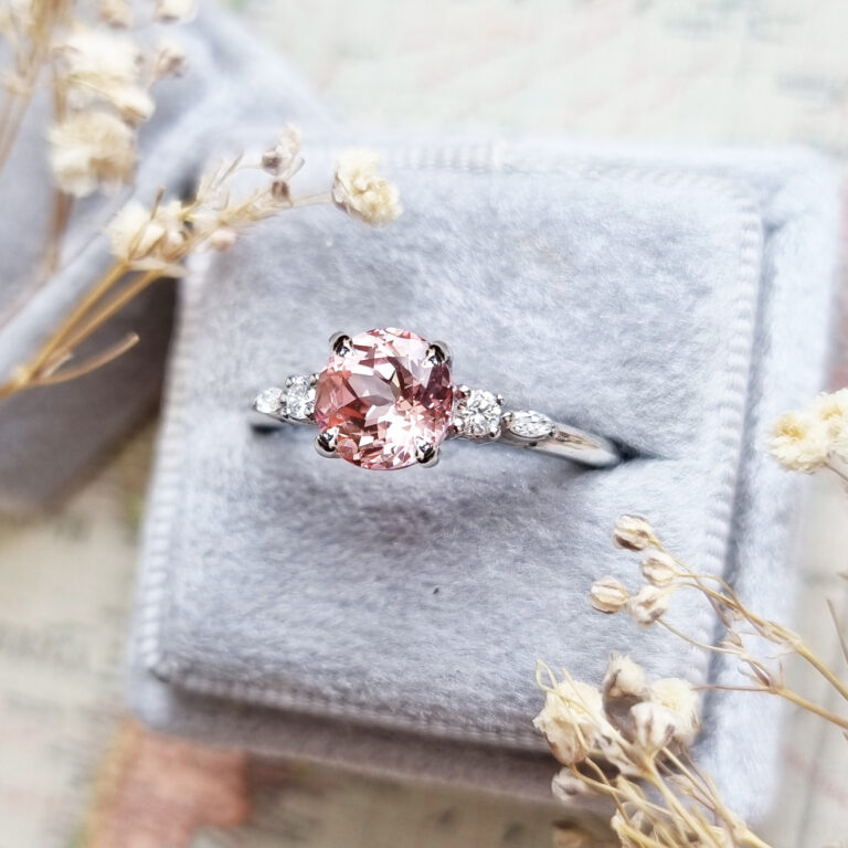 Center Chatham sapphire: 7mm (approximately 1.75ct), round cut, VVS clarity, light orange-pink