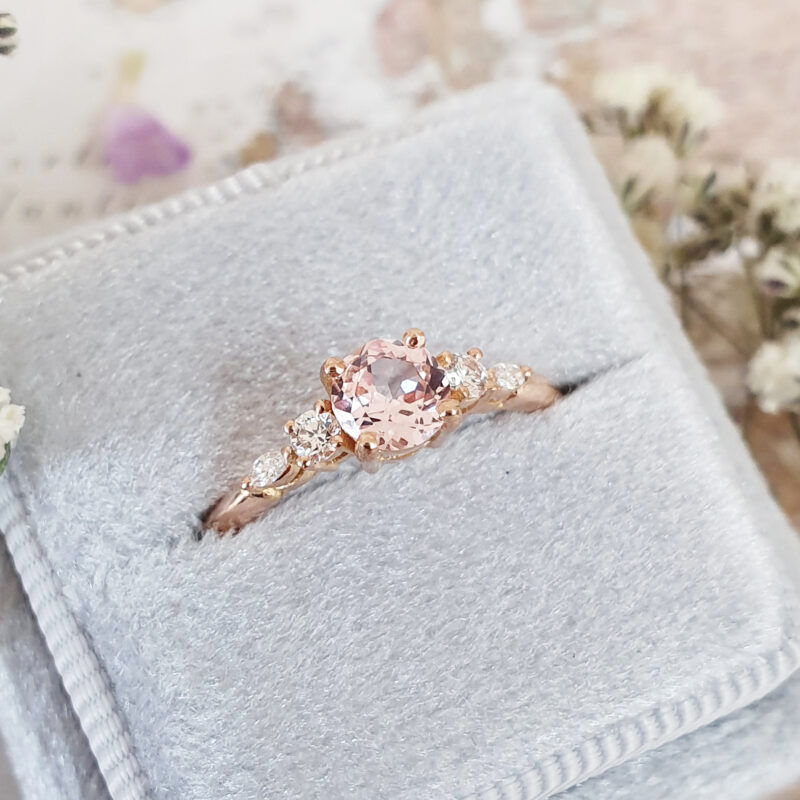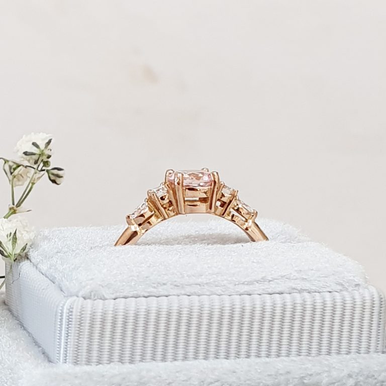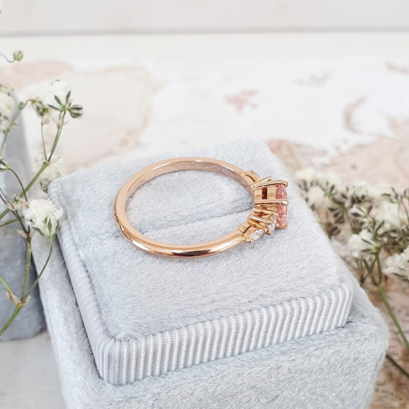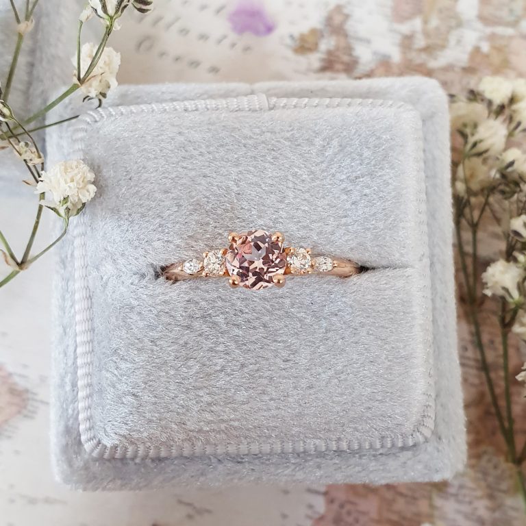 This brand new stunning ring features a central 0.5 carat lab created Champagne sapphire, set in a stunning antique inspired mount that has been studded with brilliant and marquise cut diamonds!