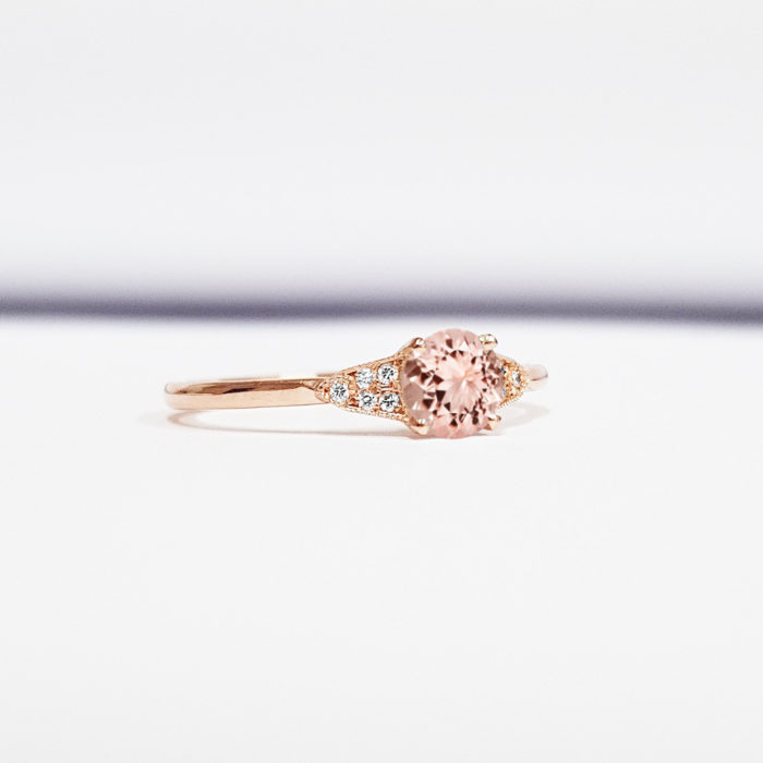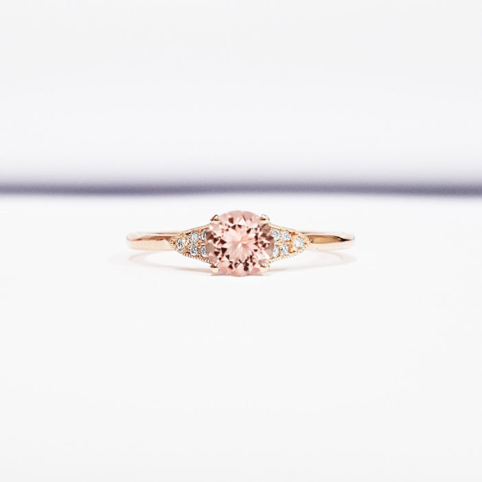 This brand new stunning ring features a central brilliant cut lab grown champagne sapphire, set in a stunning antique 1920s inspired mount, with accent diamonds.