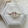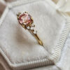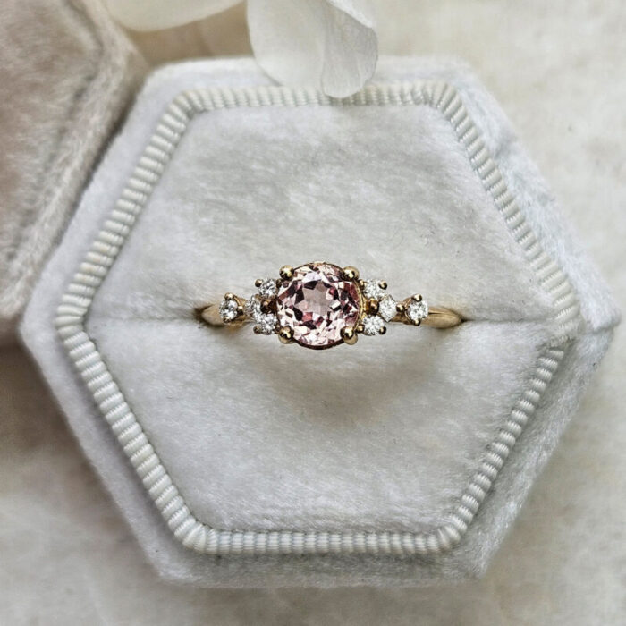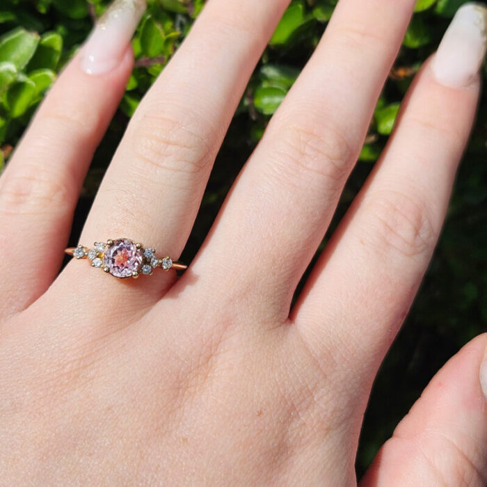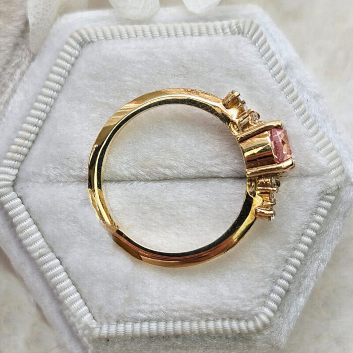 This brand new stunning ring features a central lab created champagne sapphire, set in a stunning delicate mount that has been claw set by 6 brilliant cut and 2 princess cut diamonds!