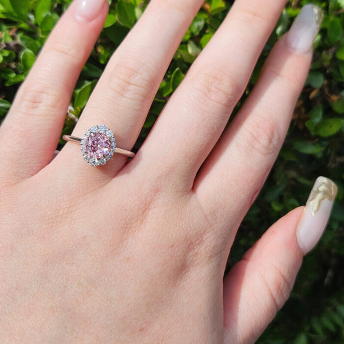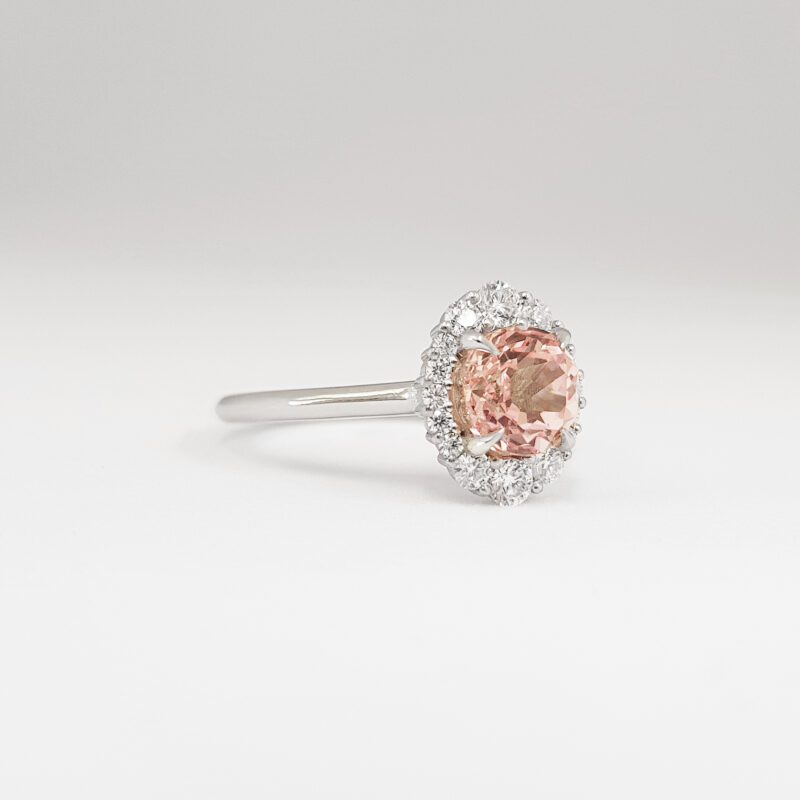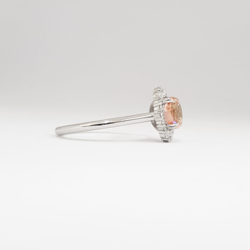 This brand new stunning ring features a central round lab grown champagne sapphire, surrounded by a halo of brilliant cut moissanites!
