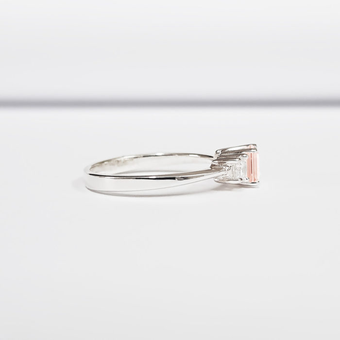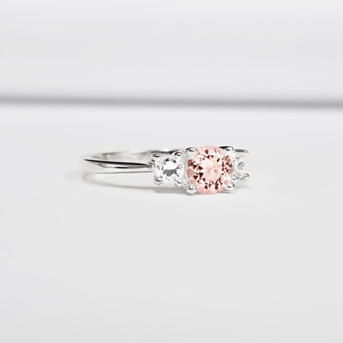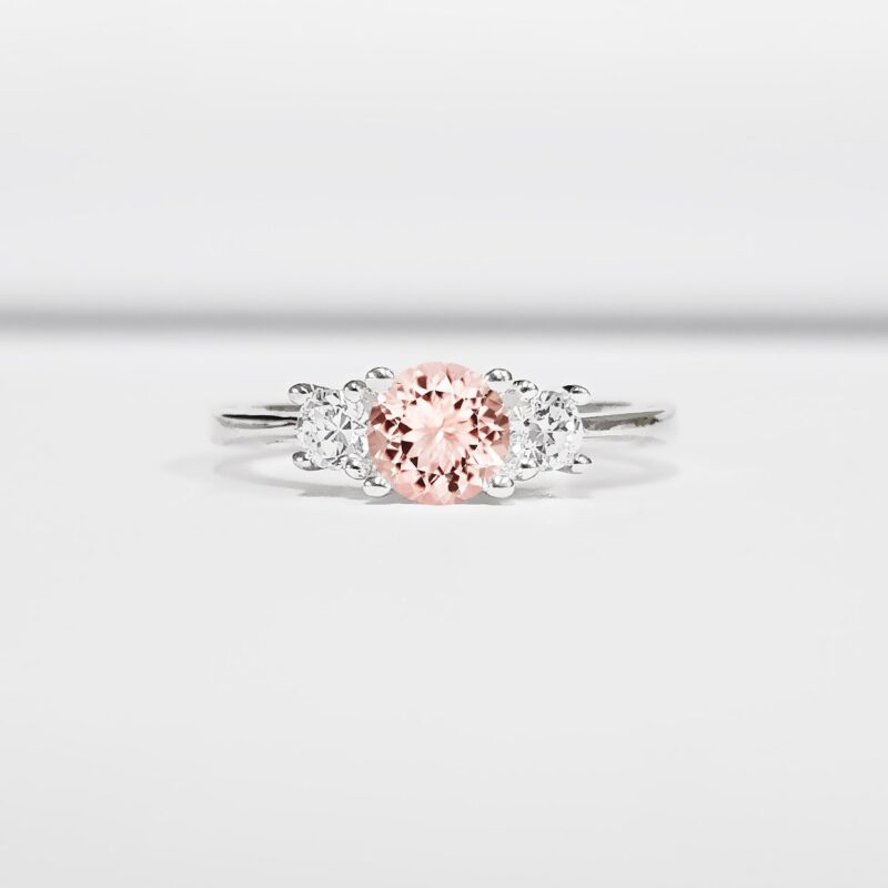 This brand new stunning ring features a central brilliant cut lab created champagne sapphire, that has been claw set with two brilliant cut moissanites, in a sleek and elegant low profile mount.