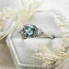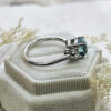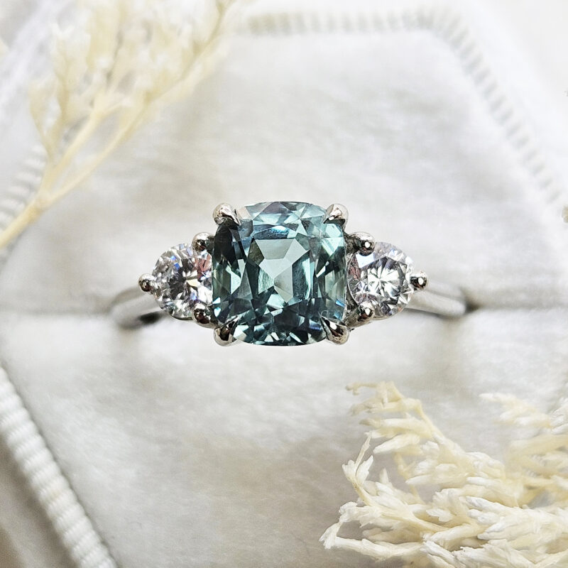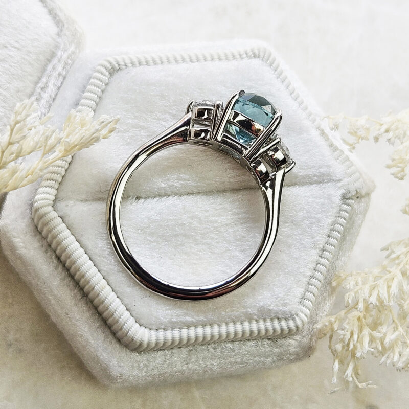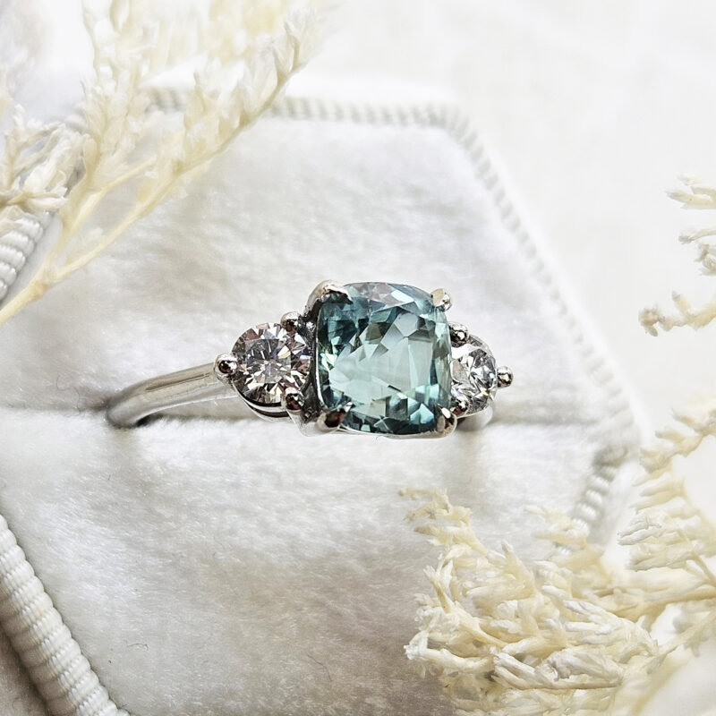 This brand new stunning ring features a central natural 2.37ct cushion cut icy blue tourmaline, that has been talon set with two brilliant cut lab grown diamonds, in a low profile platinum trilogy mount!