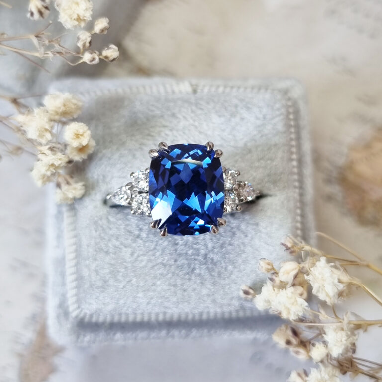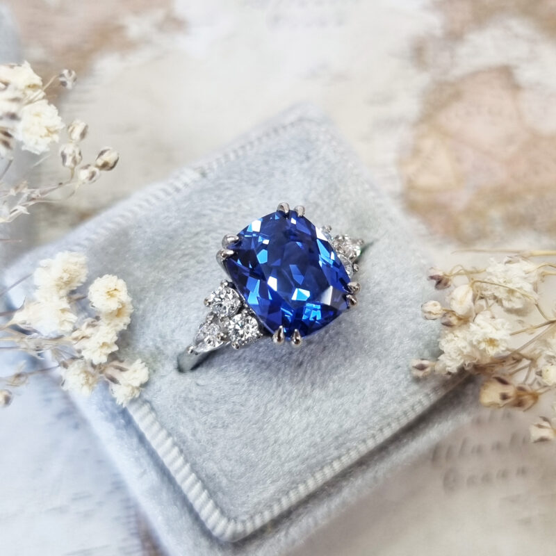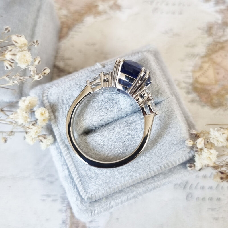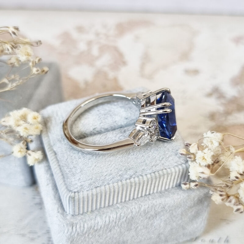This brand new ring features a central 11x9mm cushion cut lab grown blue sapphire, in a double talon setting, with round brilliant and pear cut diamonds flanking either side!