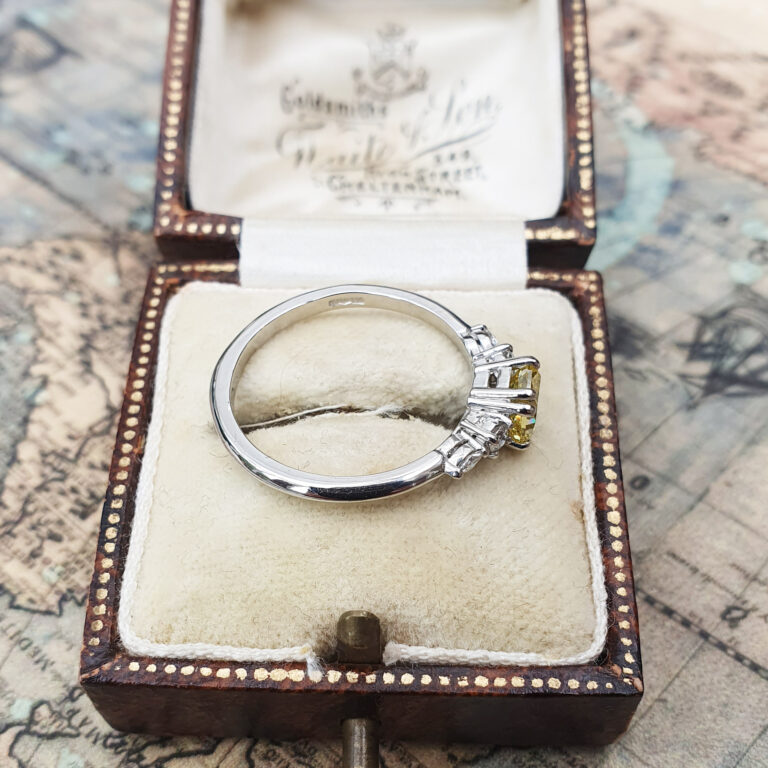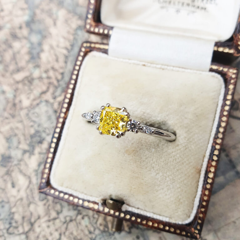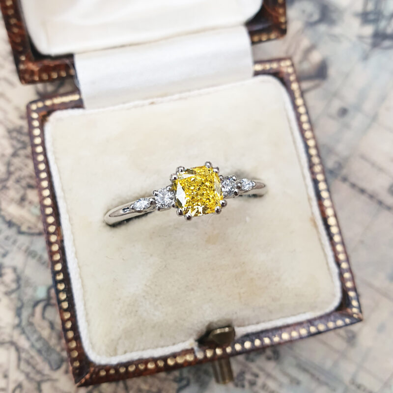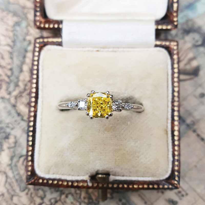 This brand new stunning ring features a central lab grown, cushion cut, fancy vivid yellow diamond, set with a mixture of marquise and round brilliant cut white diamonds in our platinum 5 stone mount!