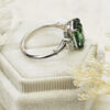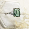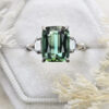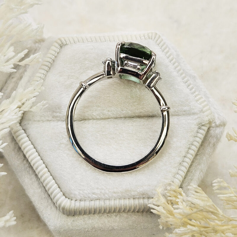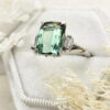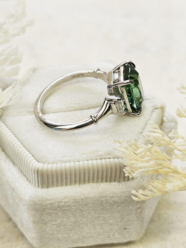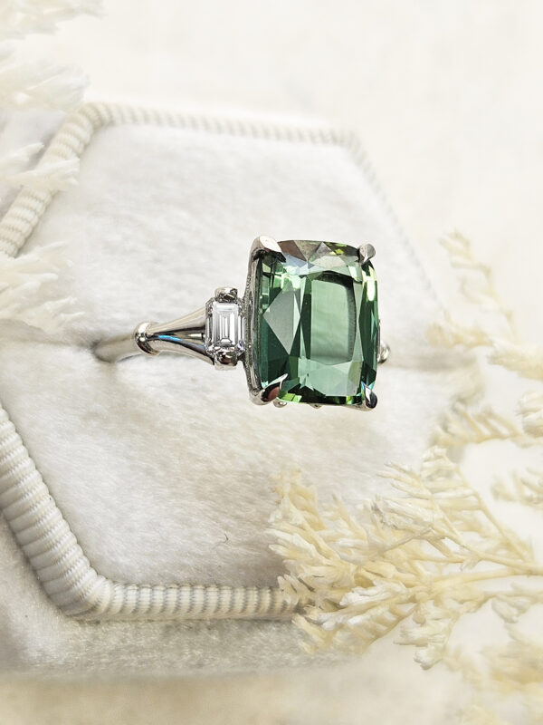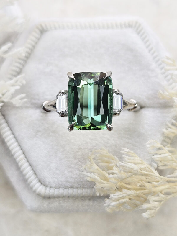 This brand new stunning ring features a central natural 3.3ct cushion cut mint tourmaline, that has been talon set with two lab grown emerald cut diamonds that flow into a tapering platinum band! The gallery of the ring has been adorned with two hidden baguette cut diamonds for an extra touch of sparkle!