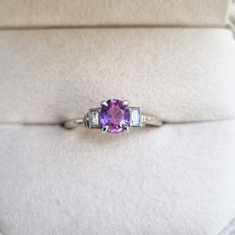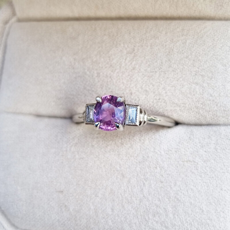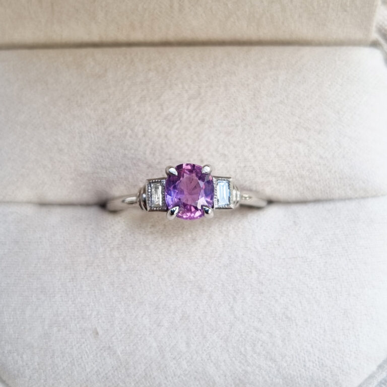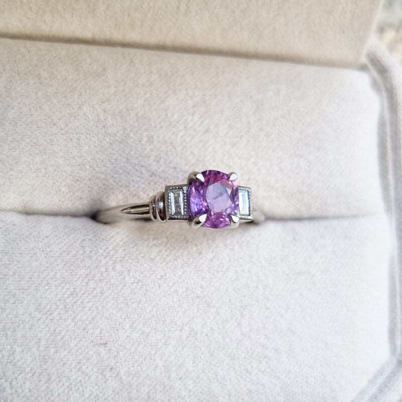 Cushion pink and purple sapphire and diamond art deco inspired ring