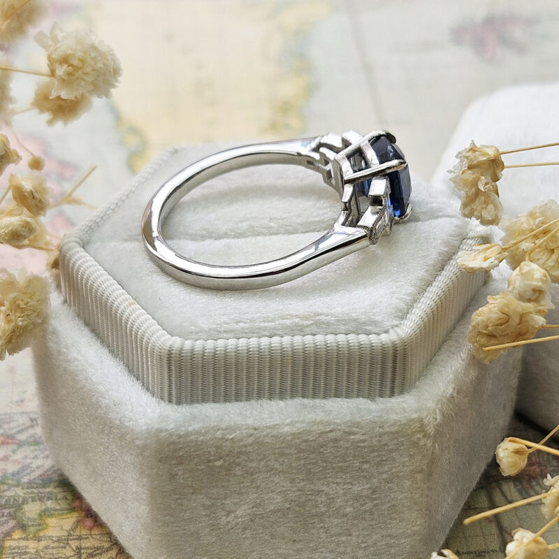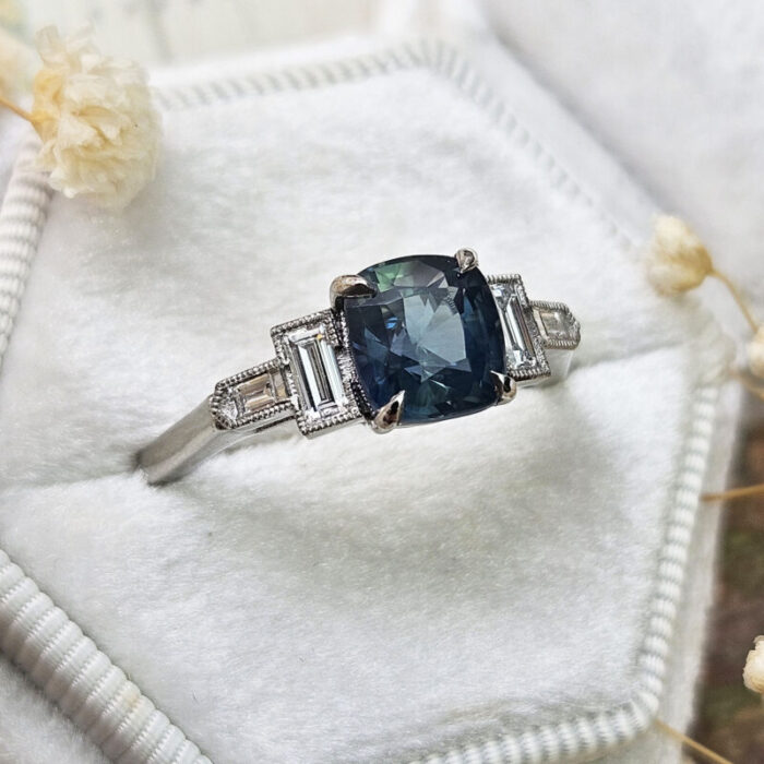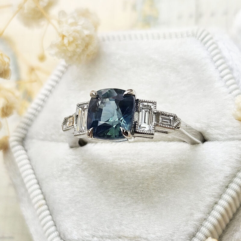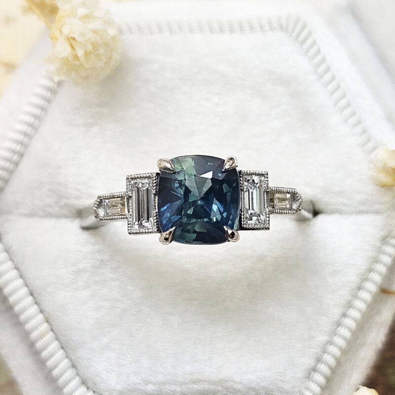 This brand new stunning ring features a central natural 2.57ct cushion cut teal sapphire, that has been flanked by four baguette cut lab grown diamonds, in milgrained rubover style settings. The geometrical contrasting shapes of the central cushion and accent baguettes create a classic 1920s art deco style vibe!