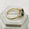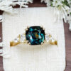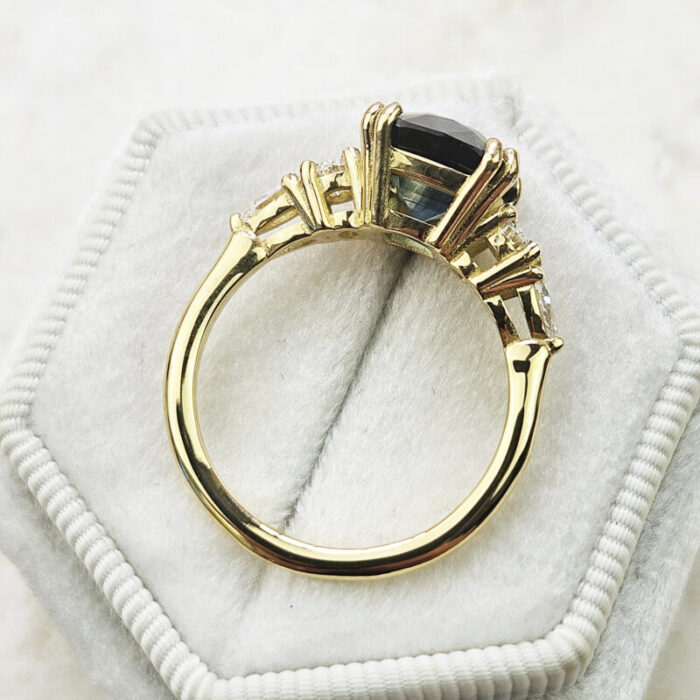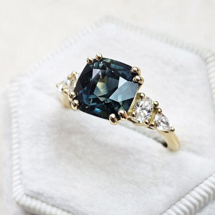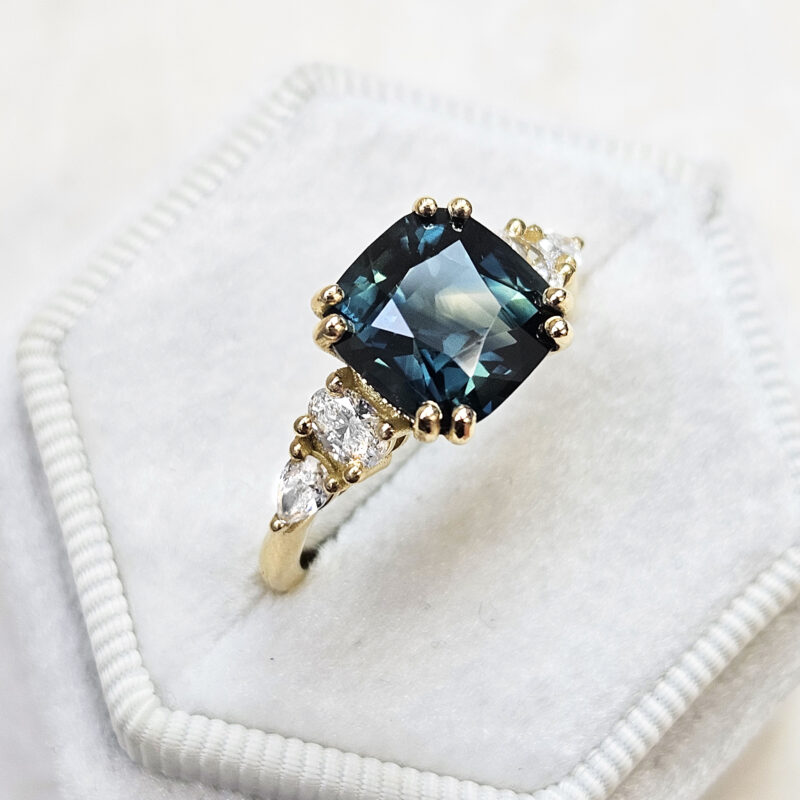 This brand new stunning ring features a central 4.03ct cushion natural teal sapphire, that has been double prong set with two oval and two pear cut lab grown diamonds, in an antique inspired 18ct yellow gold mount!