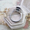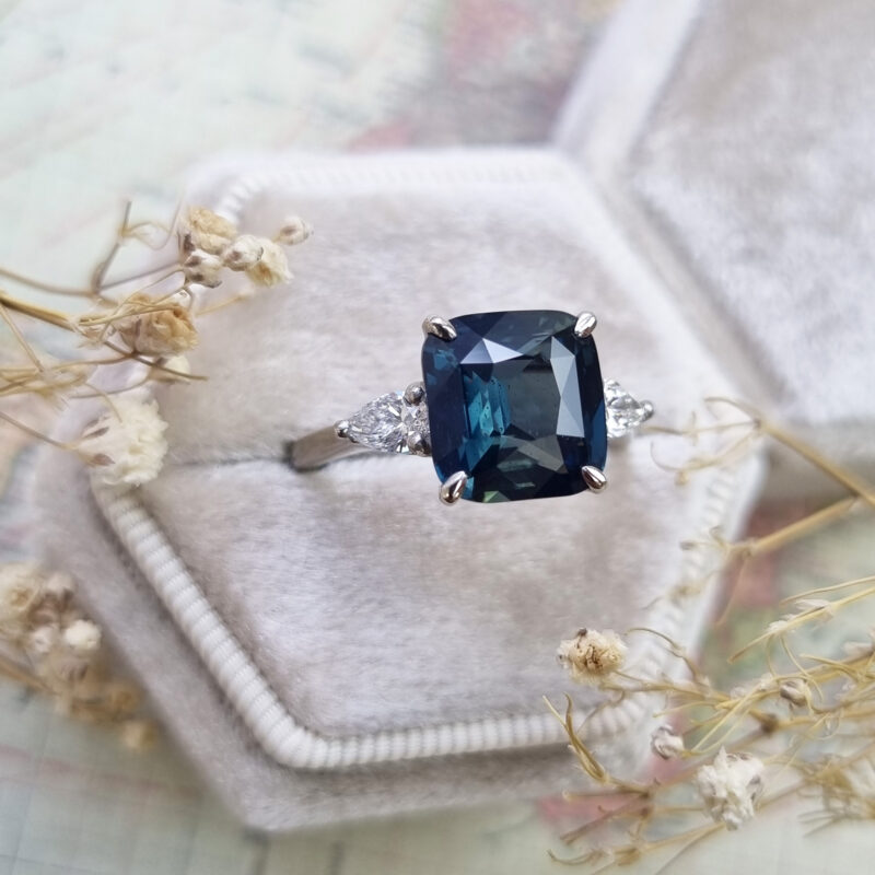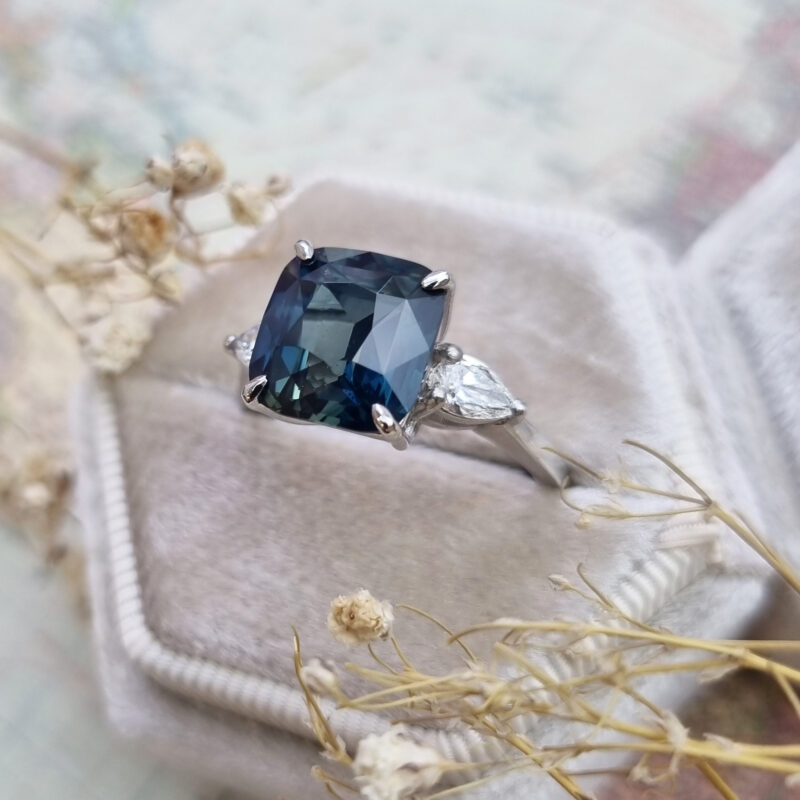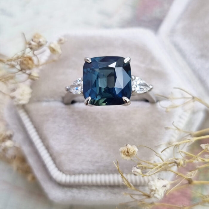 This brand new stunning ring features a beautiful 5.30 carat natural teal sapphire. It has been set with two matching pear cut lab grown diamonds, in a petite style platinum mount!