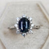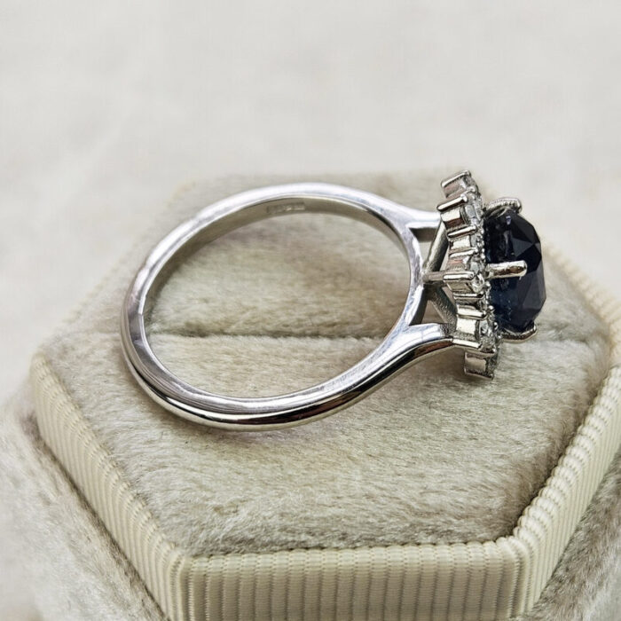 Central sapphire: 3.03ct, oval cut, 9.2×6.5×5.8mm, dark greyish-green/blue, VS clarity
