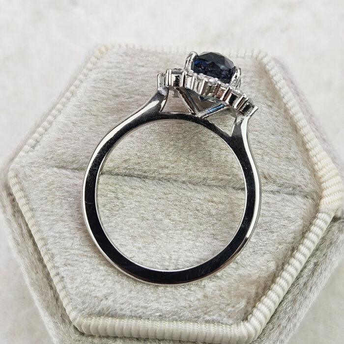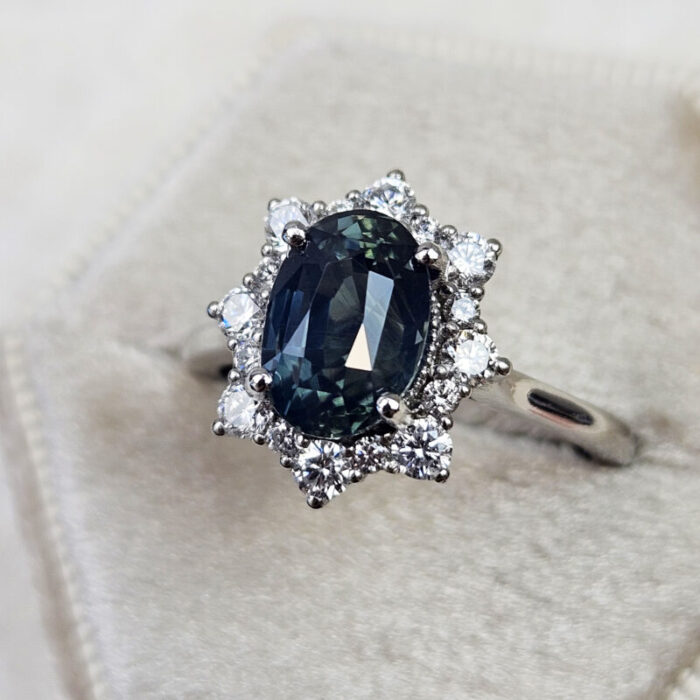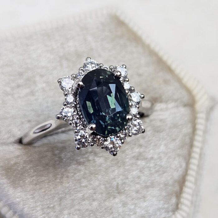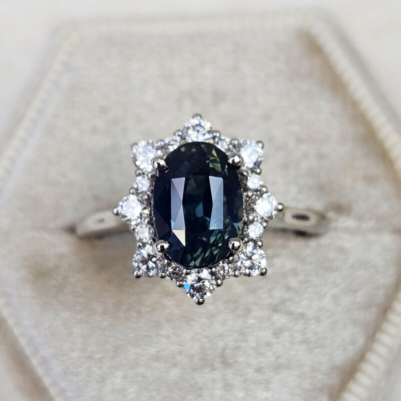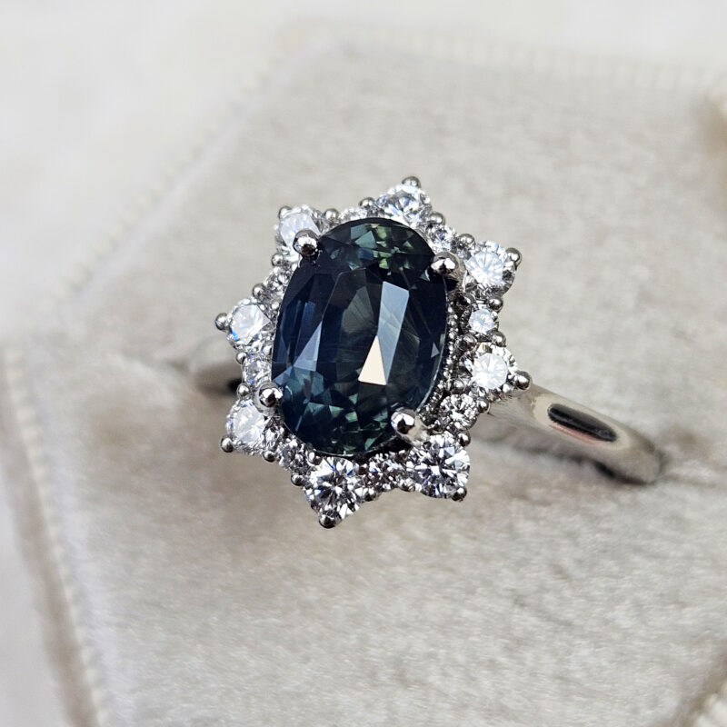 This brand new stunning ring features a central 3.03ct natural oval cut deep smoky teal sapphire. The sapphire is set in a halo of brilliant cut white diamonds in a platinum wedfit mount!