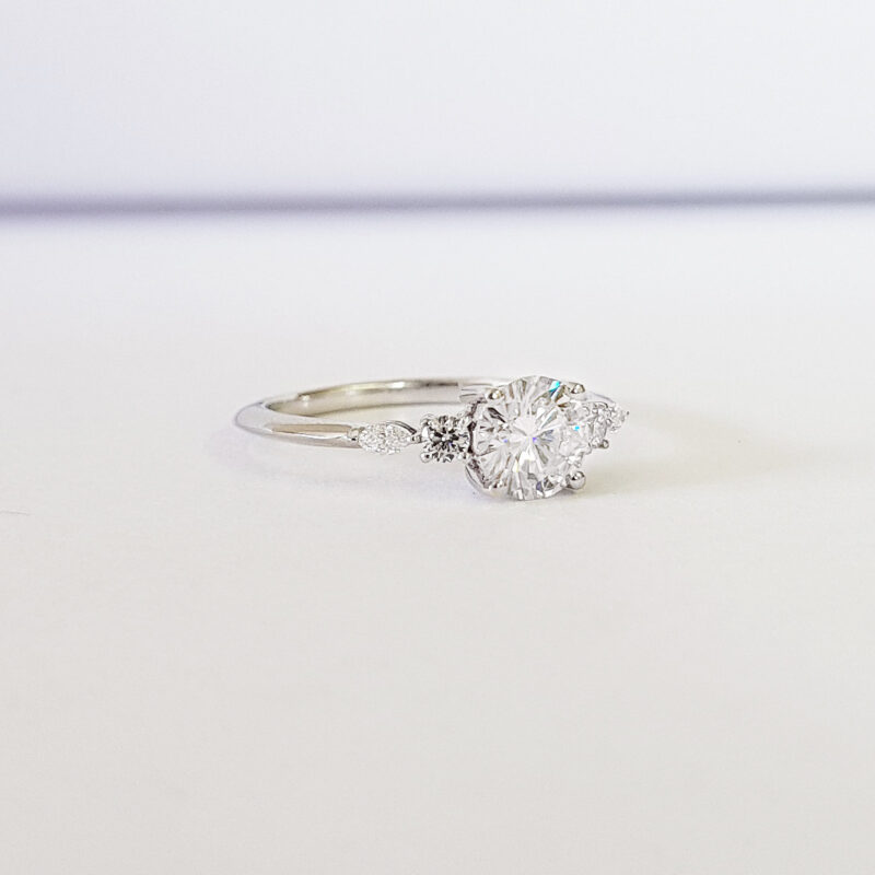 This brand new stunning ring features a central 0.8 carat Moissanite, set in a stunning antique inspired mount that has been studded with brilliant and marquise cut diamonds!