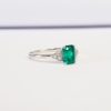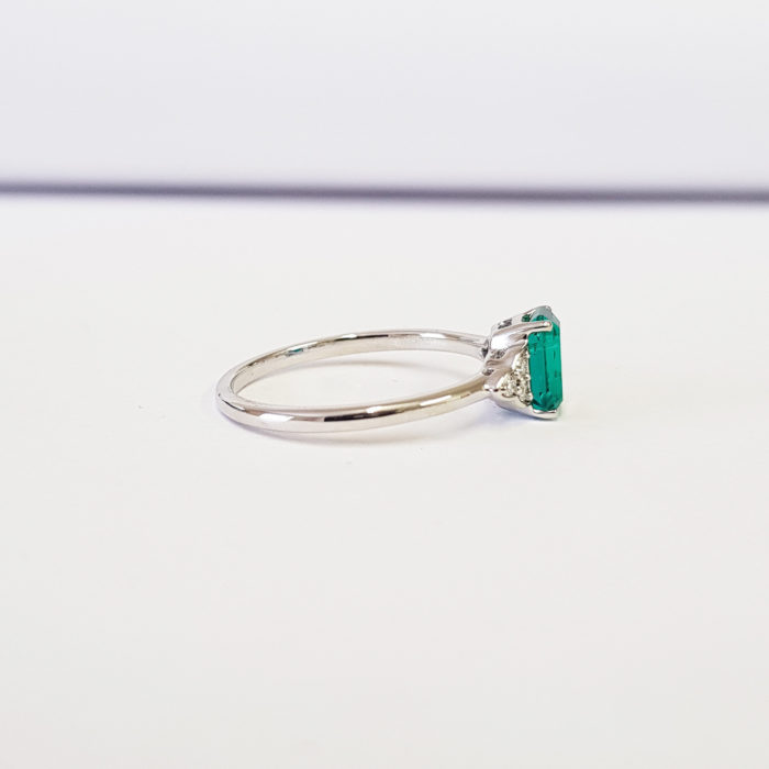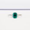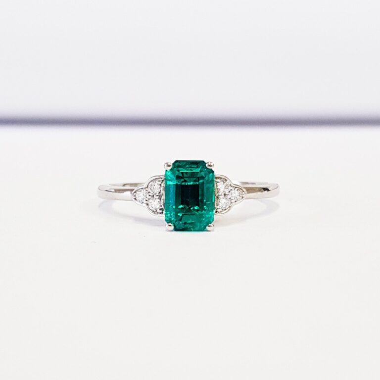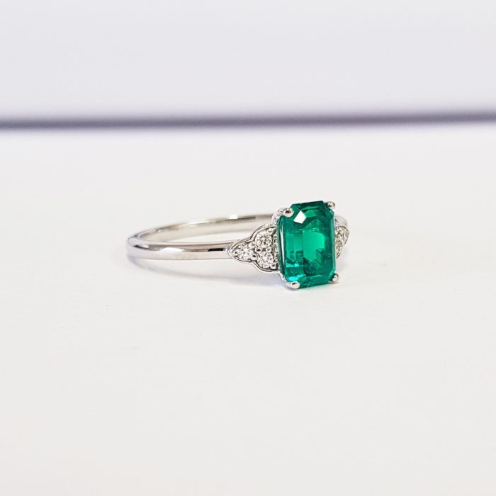 This brand new stunning ring features a central lab grown emerald, flanked by 6 diamonds in a gold or platinum mount! Lab grown emeralds are identical to natural emeralds, but at a much more affordable price.