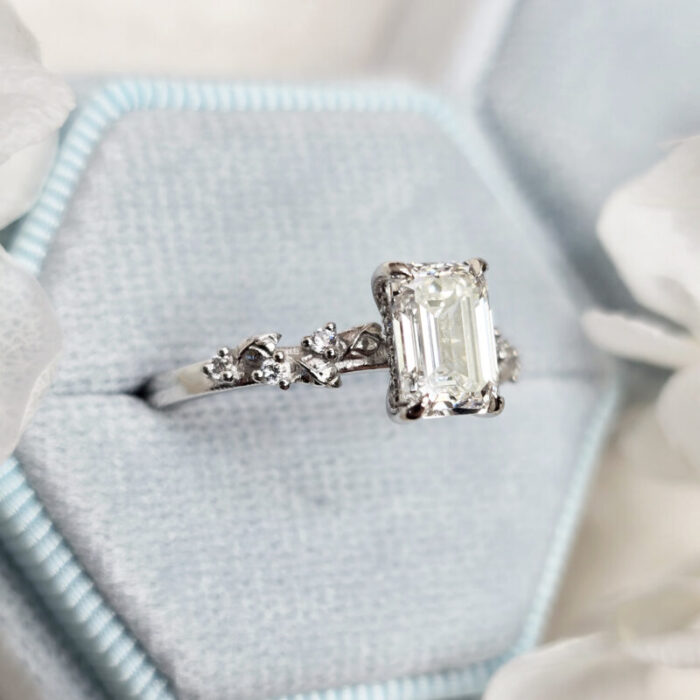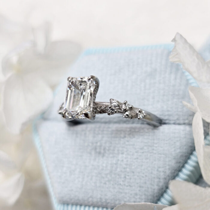 This elegant ring features a central 1.5ct Emerald cut lab grown diamond, in a 4 talon setting. The central diamond is accented with a mixture of miniature leaves and round diamonds, with an additional secret hidden halo of diamonds all in platinum!