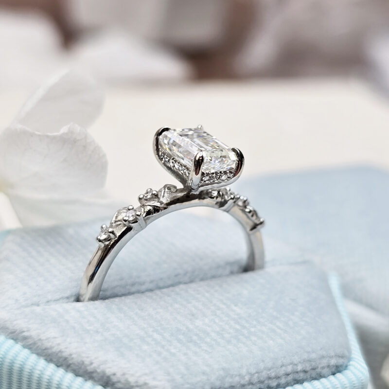 This elegant ring features a central 1.5ct Emerald cut lab grown diamond, in a 4 talon setting. The central diamond is accented with a mixture of miniature leaves and round diamonds, with an additional secret hidden halo of diamonds all in platinum!