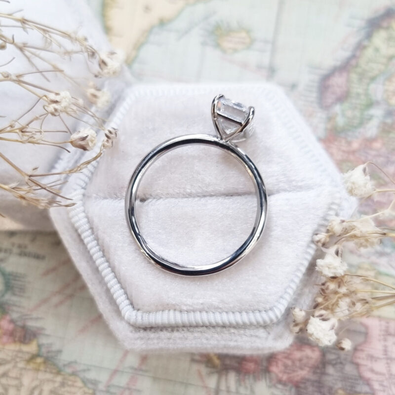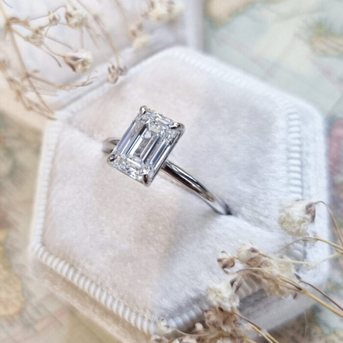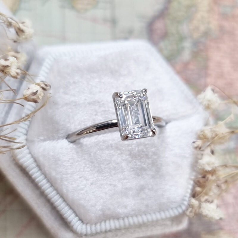 This brand new ring features a central stunning 2ct emerald cut lab grown diamond. It has been talon set in a sleek, slim style platinum mount!