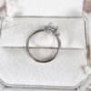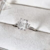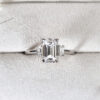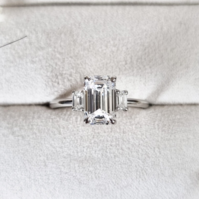 This stunning antique inspired ring features a central 2.3 carat emerald cut diamond. It has been flanked with two matching smaller emerald cut diamonds, in a bespoke low profile platinum mount!